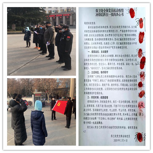 “不用扬鞭自奋蹄” 保卫处在得到疫情扩散的消息后,反应迅速,措施到位。第一时间拿出应对方案,作出应对措施,从严格门禁登记制度,到进出车辆严格消毒;从出入人员仔细登记并测量体温,到非本校人员一律禁止入内;从《保卫处防控新型冠状病毒肺炎应急预案》的,到《保卫处全体党员抗击疫情冲在一线的决心书》;这一系列的举措折射的是保卫处应对突发事件的能力、反映的是保卫处对全校师生负责的初心与执着。传递的是保卫处全体工作人员对初心使命的坚持、对理想信念的坚守、对目标任务的坚信。