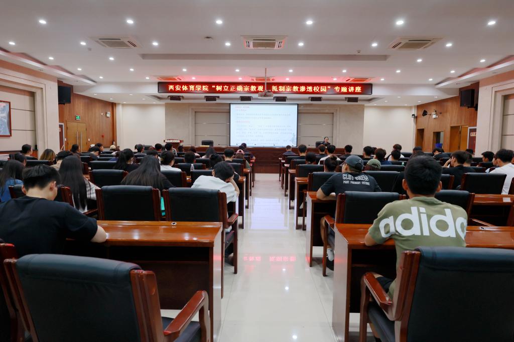 为深入贯彻落实习近平总书记关于宗教工作的重要论述,提高师生防范非法宗教活动意识,提升抵御宗教渗透校园能力,普及宗教活动政策法规,5月15日,党委统战部邀请西安市公安局碑林分局一级警长吕欣为365官网师生作《树立正确宗教观抵制宗教渗透校园》专题讲座。各二级学院(部、校)辅导员,学生党、团员代表及党委统战部全体同志参加讲座。校党委校长办公室主任、党委统战部常务副部长张军主持。