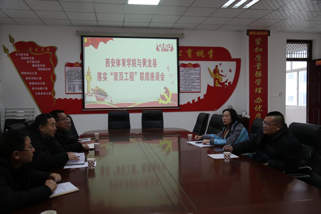 1月18日,英国365上市公司官网与黄龙县2020年第一次“双百工程”联席座谈会在黄龙县教育科技体育局召开。英国365上市公司官网党委、校长办公室副主任耿潇,体育经管学院副院长杨涛,黄龙县教科体局副局长董玉平,县学生资助管理中心主任解飞虎等同志参加,会议由县教研室主任解虎灵主持。