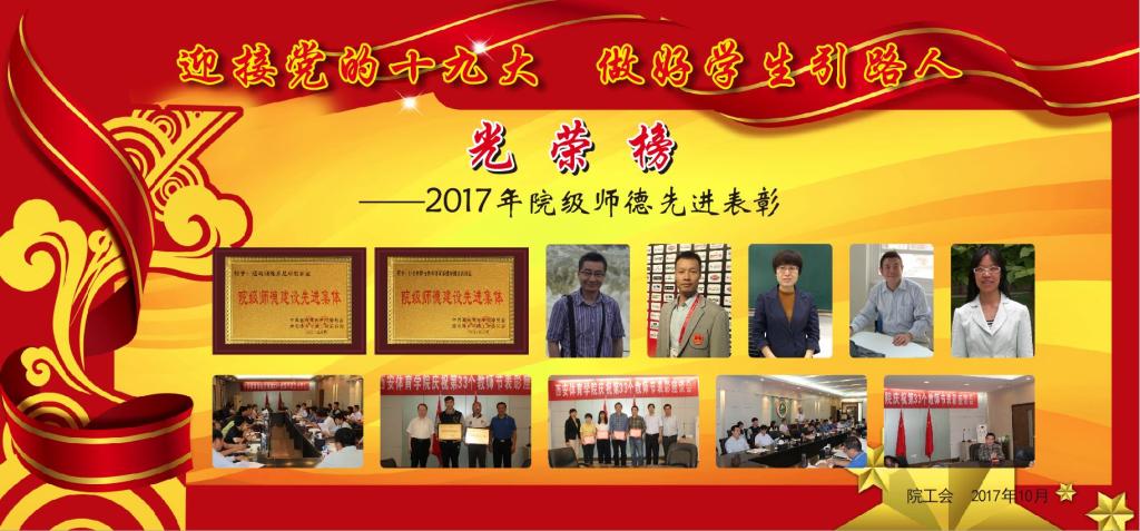为大力弘扬“学高为师、身正为范”的高尚品德和无私奉献精神,促进我院师德建设工作的深入开展,以实际行动迎接教育部即将对我院进行的本科教学水平审核评估工作,院工会在党的十九大召开前夕,利用宣传栏、校园网和学院微信公众平台,集中对2017年评选的院级师德建设先进集体和师德先进个人进行了广为宣传活动。