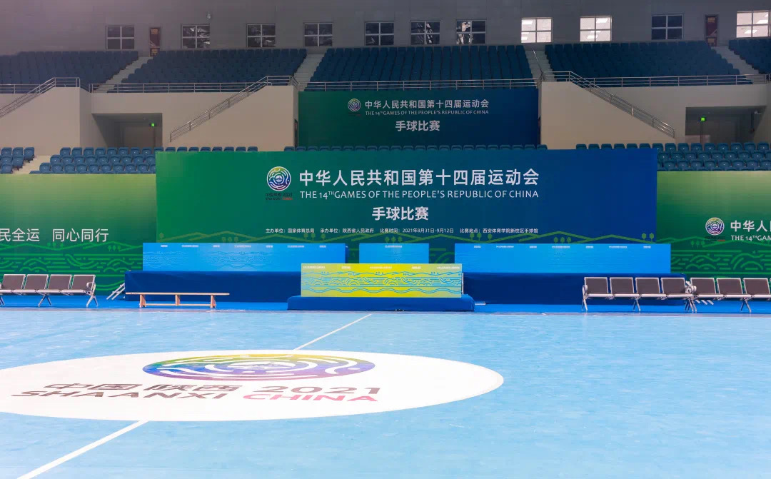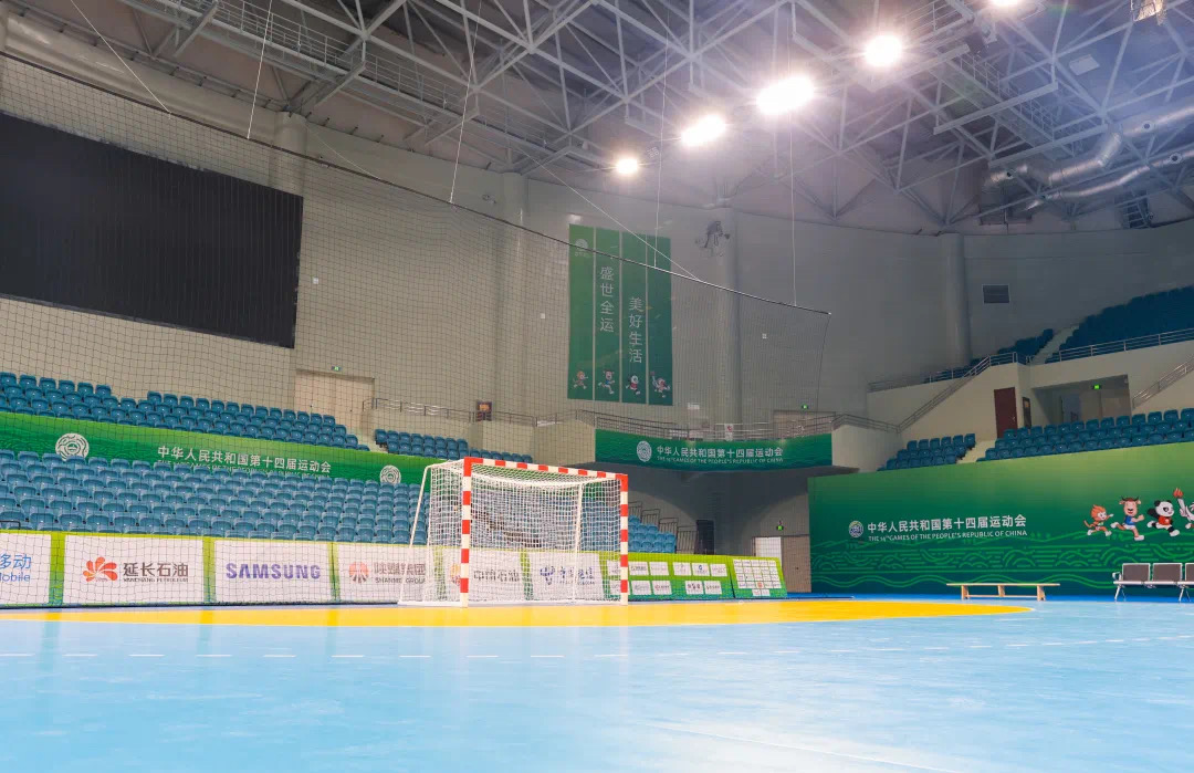 第十四届全运会手球赛事场馆位于英国365上市公司官网鄠邑校区手球馆,该馆是按照国际级手球赛事的标准规划设计、建设、选材的甲级综合性体育场馆,占地面积20026㎡,总建筑面积34950㎡,其中地上32870㎡,地下2080㎡,总座位数6567 个。场馆功能设施先进,夜间照明条件良好,赛后可承担篮球、排球、蹦床等综合性比赛使用。其外形独特,曲线流畅,恢弘大气,古朴典雅,理念超前,功能齐全,别具一格的“花生”造型也引发了诸多关注。手球比赛场地为长方形,长40米,宽20米。