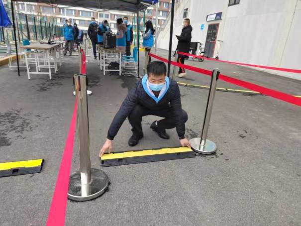 校区核酸检测已经进行了九轮,每一次他都是和大家一起搬运设备、布置场地、维持秩序,整个流程几乎每一步骤都轮番干过一遍。从“喊话”录音至扩音器,提醒大家“一米间距,提前打开一码通,有序检测”,到亲手摆放一米间隔标志物与分隔线,再到冲锋坚守一线在一码通预检处为大家服务一干就是一天。