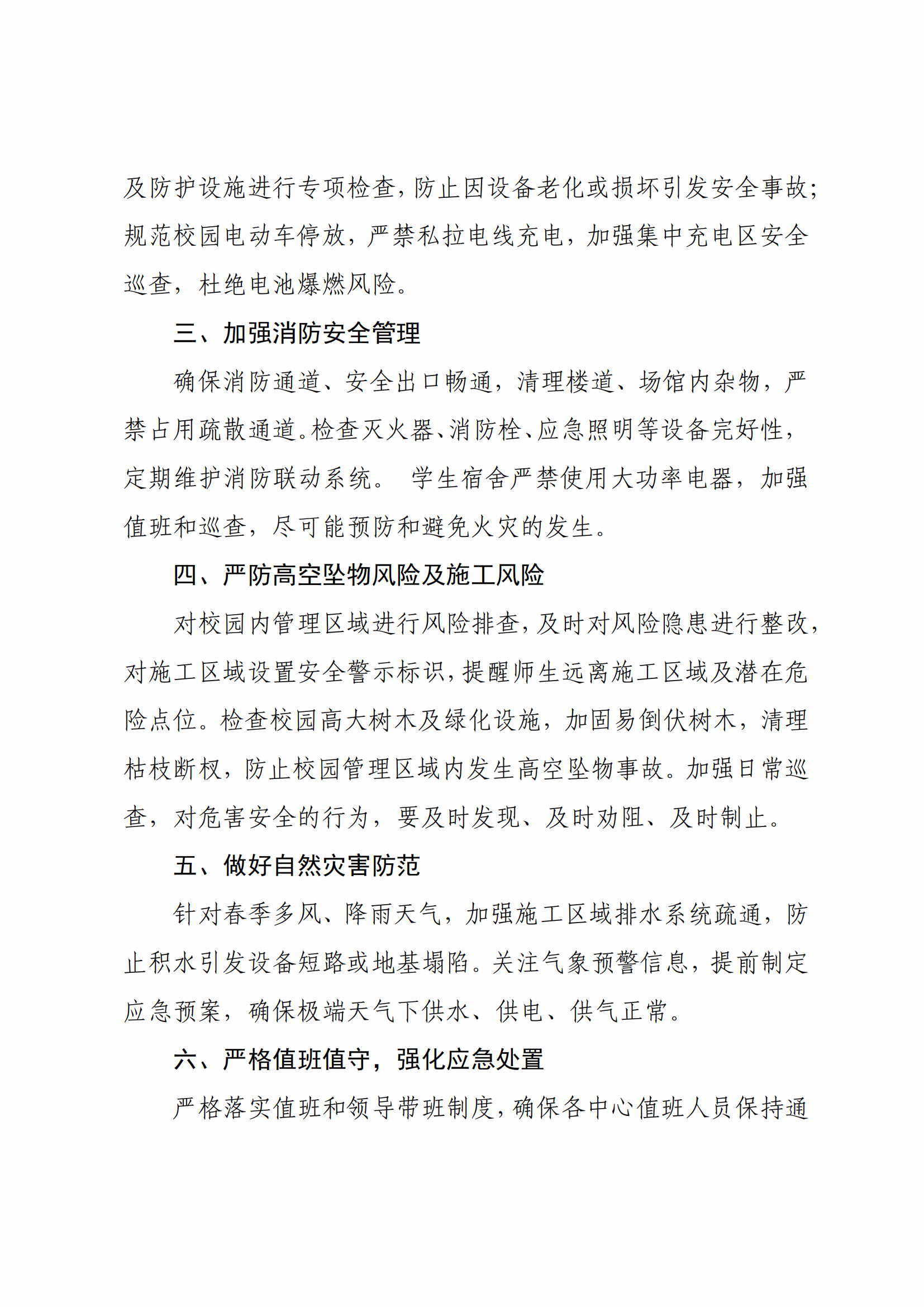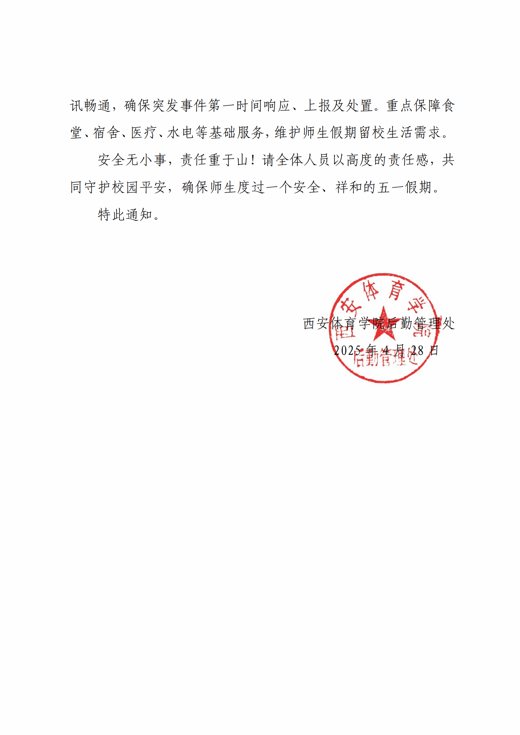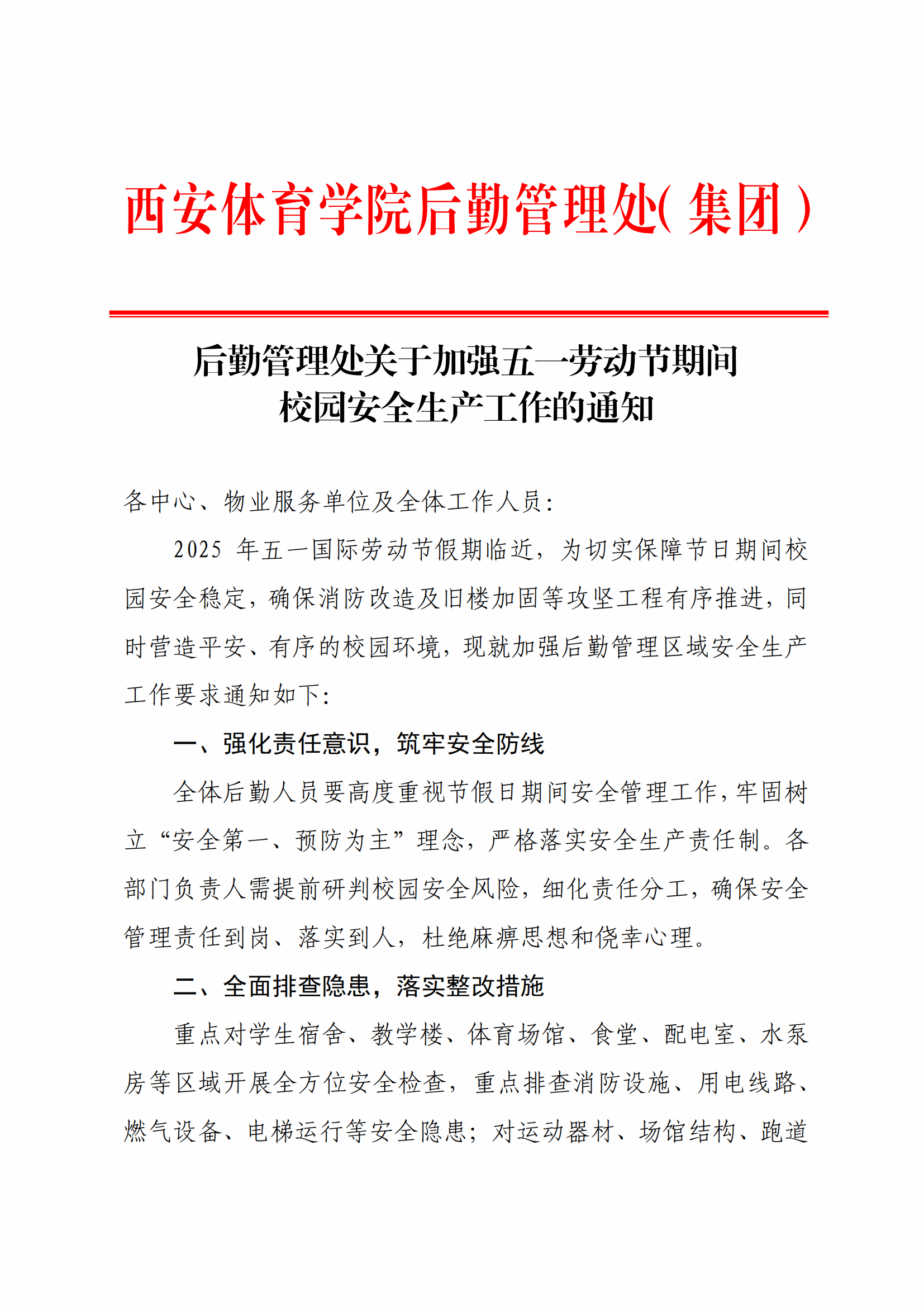 各中心、物业服务单位及全体工作人员: 2025年五一国际劳动节假期临近,为切实保障节日期间校园安全稳定,确保消防改造及旧楼加固等攻坚工程有序推进,同时营造平安、有序的校园环境,现就加强后勤管理区域安全生产工作要求通知如下: 一、强化责任意识,筑牢安全防线 全体后勤人员要高度重视节假日期间安全管理工作,牢固树立“安全第一、预防为主”理念,严格落实安全生产责任制。各部门负责人需提前研判校园安全风险,细化责任分工,确保安全管理责任到岗、落实到人,杜绝麻痹思想和侥幸心理。 二、全面排查隐患,落实整改措施 重点对学生宿舍、教学楼、体育场馆、食堂、配电室、水泵房等区域开展全方位安全检查,重点排查消防设施、用电线路、燃气设备、电梯运行等安全隐患;对运动器材、场馆结构、跑道及防护设施进行专项检查,防止因设备老化或损坏引发安全事故;规范校园电动车停放,严禁私拉电线充电,加强集中充电区安全巡查,杜绝电池爆燃风险。 三、加强消防安全管理 确保消防通道、安全出口畅通,清理楼道、场馆内杂物,严禁占用疏散通道。检查灭火器、消防栓、应急照明等设备完好性,定期维护消防联动系统。学生宿舍严禁使用大功率电器,加强值班和巡查,尽可能预防和避免火灾的发生。 四、严防高空坠物风险及施工风险 对校园内管理区域进行风险排查,及时对风险隐患进行整改,对施工区域设置安全警示标识,提醒师生远离施工区域及潜在危险点位。检查校园高大树木及绿化设施,加固易倒伏树木,清理枯枝断杈,防止校园管理区域内发生高空坠物事故。加强日常巡查,对危害安全的行为,要及时发现、及时劝阻、及时制止。 五、做好自然灾害防范 针对春季多风、降雨天气,加强施工区域排水系统疏通,防止积水引发设备短路或地基塌陷。关注气象预警信息,提前制定应急预案,确保极端天气下供水、供电、供气正常。 六、严格值班值守,强化应急处置 严格落实值班和领导带班制度,确保各中心值班人员保持通讯畅通,确保突发事件第一时间响应、上报及处置。重点保障食堂、宿舍、医疗、水电等基础服务,维护师生假期留校生活需求。 安全无小事,责任重于山!请全体人员以高度的责任感,共同守护校园平安,确保师生度过一个安全、祥和的五一假期 特此通知。 后勤管理处 2025年4月30日
