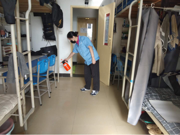 (二)后勤管理处(集团)学生公寓管理中心在对工作人员进行体温检测、登记后,严格按照校医院《学生公寓消毒指南》要求做好学生公寓清洁、消毒每日2次,通风工作每日3次,每次30分钟,以及学生体温检测工作。