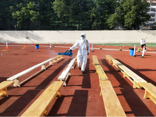 考试用卫生间(田径场、综合馆1层、篮球场)消杀4次;