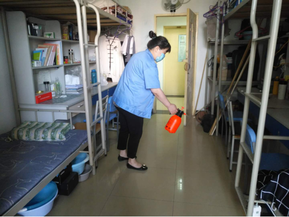 (二)后勤管理处(集团)学生公寓管理中心在对工作人员进行体温检测、登记后,严格按照校医院《学生公寓消毒指南》要求做好学生公寓清洁、消毒每日2次,通风工作每日3次,每次30分钟,以及学生体温检测工作。