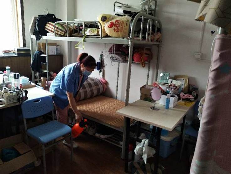 (一)后勤管理处(集团)学生公寓管理中心在对工作人员进行体温检测、登记后,严格按照校医院《学生公寓消毒指南》要求做好学生公寓清洁、消毒每日2次,通风工作每日3次,每次30分钟,以及学生体温检测工作。