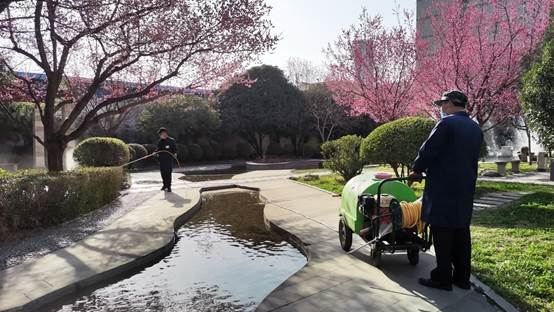 因地制宜合理的分析,严格执行危险品安全使用规定,专人专管,选用低毒高效农药,控制药物比例,确保病虫害防治由表及里不交叉感染。园林绿化团队利用打药机人工喷雾作业、涂摸、浇灌等多种方式,确保校园园区、家属区防治无死角,能够有效预防春季病虫害的滋生,改善绿植、苗木、花卉等生长状况,确保校园春季桃花、广玉兰、连翘、樱花等在不同时期健康生长。