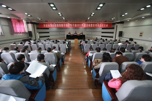 本网讯为进一步加强高等学校领导班子和领导干部队伍建设,改进和完善干部考核评价工作,根据省委、省政府有关要求,3月30日,我院在教学楼一楼报告厅召开英国365上市公司官网领导班子和领导干部2011年度目标责任考核工作大会。陕西省高等学校年度目标责任考核英国365上市公司官网考核工作组组长、省体育局纪检组组长支希贤,省体育局人事处处长马新范,省委组织部宣教处副调研员周群以及考核小组成员可宗革、高志国、甄颖出席大会。学院党委委员、纪委委员、学术委员会委员、工会委员,正高职称专业技术人员,副处级以上干部,市级以上人大代表、政协委员,各民主党派主要负责人,学生代表近150人参加了大会。大会由学院党委书记杜平主持。