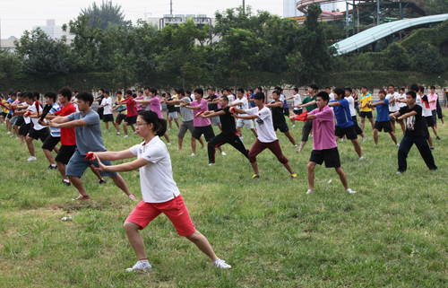 尽管此前只排练了短短几日,队员们表演中展现出的动感、激情与积极向上的人文风采还是赢得了在场观众的阵阵掌声。王建军局长在随后的讲话中对大家的精彩表演表示肯定,对不畏酷暑,刻苦训练的广大师生以及参演小朋友们表示慰问和衷心感谢。他指出,西安体院是建国初就成立的具有优秀传统和良好作风的学校,在西北地区乃至全国享有盛名,通过此次表演活动,将进一步向外界展示西安体院乃至陕365官网育的风采。王局长强调,365官网承演的开幕式三篇章之“科学健身、欢乐三秦”一章,是开幕式的重中之重,希望大家发挥体育人敢于拼搏,不怕疲劳的精神,继续全力投入排练,并预祝表演取得圆满成功。