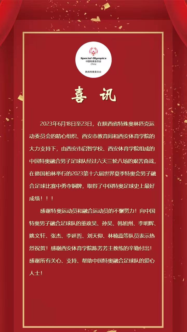 比赛结束后,陕西省残联、陕西省特奥委员会第一时间向球队全体将士表达了祝贺和感谢,“感谢特奥运动员和融合运动员的不懈努力!向中国特奥男子融合足球队的董政昊、孙昊、韩旭州、李明辉、姚文轩、张杰、李延哲、刘天仰、林楠蕊等队员表示热烈祝贺!感谢英国365上市公司官网陈芳芳主教练的辛勤付出!”