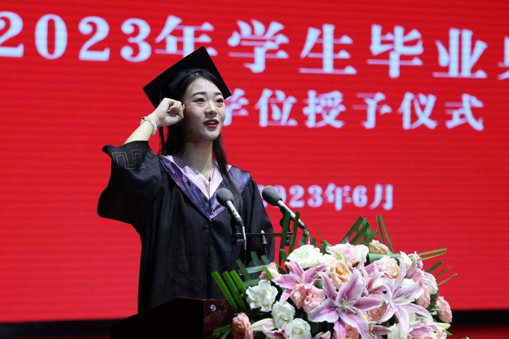 来自研究生部的杨紫璇和艺术学院的牛志远分别代表2023届毕业的硕士研究生和本科生发表了毕业致辞,对母校的辛勤培养、老师的谆谆教诲、同窗的相遇相伴致以最诚挚的感谢。他们代表所有毕业生发出铮铮誓言:将牢记“严谨、创新、团结、拼搏”的365官网校训以“明是非、守原则、怀天下、奋力为”的立身之道,在人生道路上披荆斩棘,在各行各业展现365官网风貌!