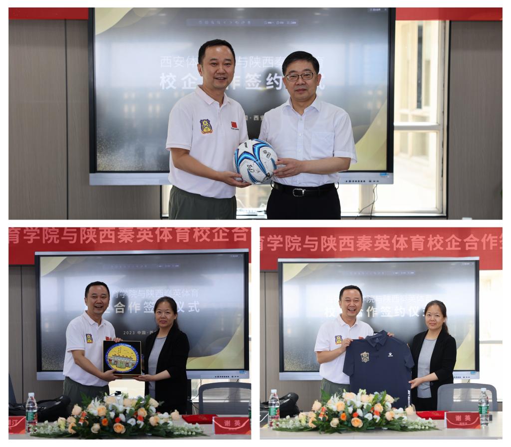 谢英代表学校与秦英体育进行签约并互赠礼物。