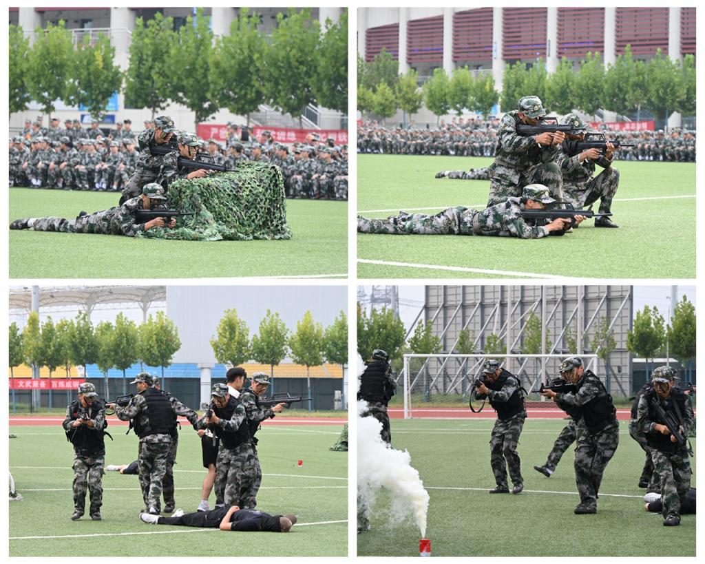 随着仪仗队护送军训团旗经过主席台,此次军训实操汇演正式拉开帷幕。表演方阵和各学院连队方阵依次经过主席台,接受领导老师的检阅。他们动作整齐划一,脚步铿锵坚定,口号声音嘹亮,一招一式都展示出了力量与气魄,青涩的脸庞上洋溢着坚定与炙热。各营通过选拔产生特色连队,进行特色科目训练,他们带来的军体拳、警棍盾牌操、匕首操、武术项目展示汇报,动作霸气威武、气势如虹,赢得现场热烈掌声。