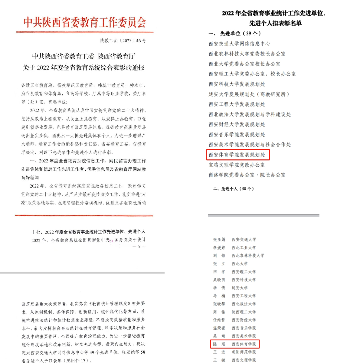 本网讯 中共陕西省委教育工委、陕西省教育厅印发了《关于2022年度全省教育系统综合表彰的通报》(陕教工函〔2023〕46号),365官网发展规划处获评“2022年度陕西省教育事业统计工作先进单位”,发展规划处陆瑶同志获评“先进个人”。