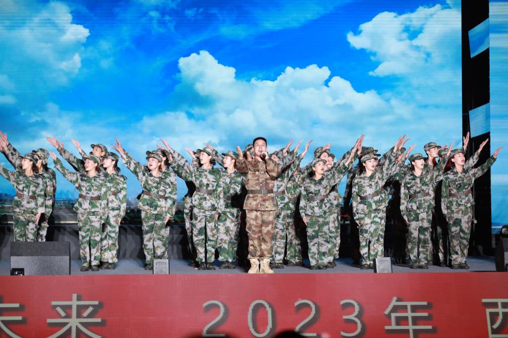 部分2023级新生参演的情景剧《士兵的桂冠》用激昂的歌声赞颂了士兵们为祖国奉献青春,挺起高昂头颅、保家卫国不畏艰险的顽强意志。