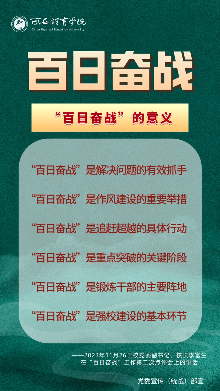 为持续掀起“百日奋战”的热潮,保持学校各项事业高质量发展的战略定力,动员全校师生员工为学校改革发展勠力同心、接续奋斗,本公众号将以专栏形式推出“百个要点”的“百张海报”,将“百日奋战”相关会议的主要会议精神和重点内容进行摘录报道,以供师生员工学习交流。