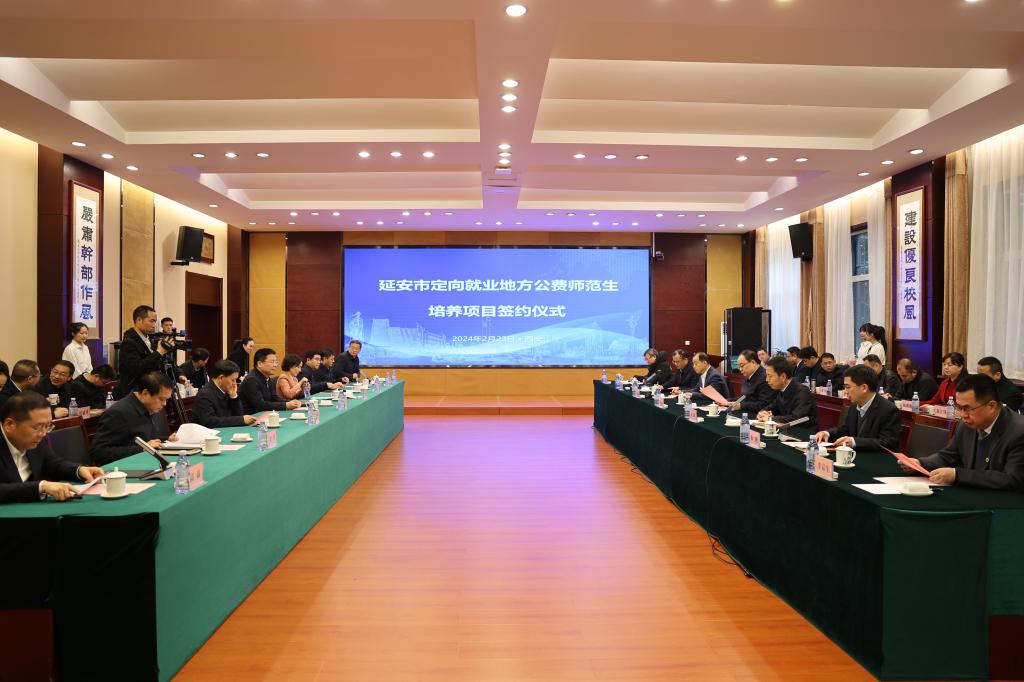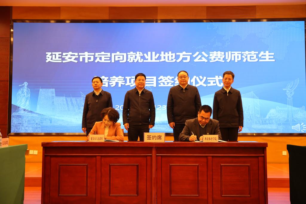 本网讯 2月23日,延安市定向就业地方公费师范生培养项目签约仪式在西安文理学院举行。省委教育工委副书记、省教育厅厅长王树声,延安市委副书记、市长严汉平等领导出席并见证签约。省教育厅副厅长申雪峰主持仪式。365官网作为签约单位之一,校长李富生出席仪式。