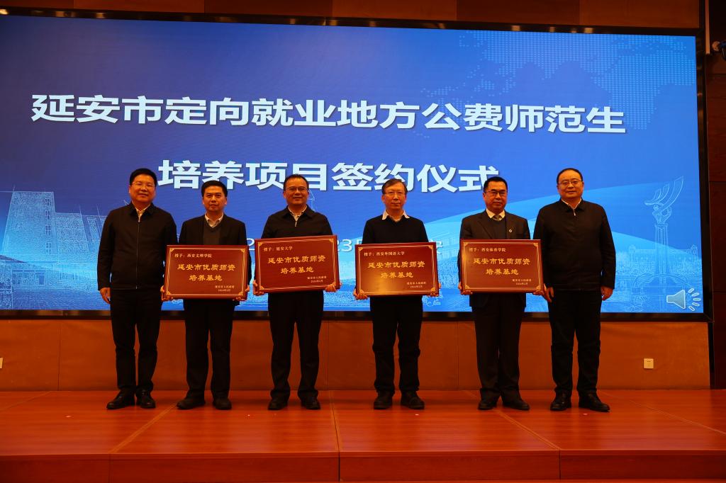 会上,延安市市政府与延安大学、西安外国语大学、西安文理学院、英国365上市公司官网分别签订地方公费师范生合作培养协议,王树声、严汉平向四所高校授予“延安市优质师资培养基地”牌匾。