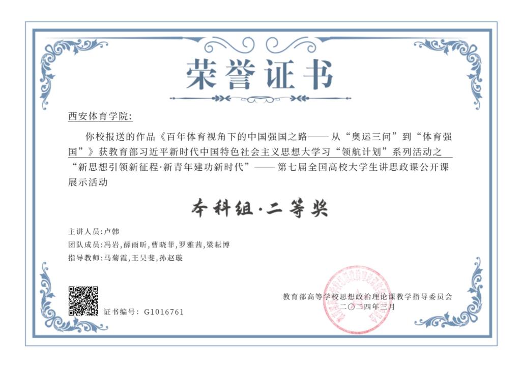 该团队加强冠军资源、体育赛事、红色校史等资源挖掘,做好“特色融入”,开辟了红色体育文化、体育法治教育等具有365官网独有特色的研究领域和方向。获批国家级项目3项、省部级项目20余项,获陕西省哲学社会科学优秀成果奖2项,出版著作5部,编写教材2部。《思想道德与法治》课获批陕西省省级一流本科课程,其余四门主课均为校级一流课程。获批陕西省“习近平新时代中国特色社会主义思想‘三进’省级精品课程项目”2项,获批陕西省“大思政课”建设项目2项。党委书记刘子实教授负责的《体育特色思政教学资源开发与共享研究》获批为陕西“大思政课”教学资源共享平台项目,马克思主义学院秋实教授负责的《“红色体育”大思政课建设》获批为陕西高校“大思政课”建设“一校一品牌”创建项目。