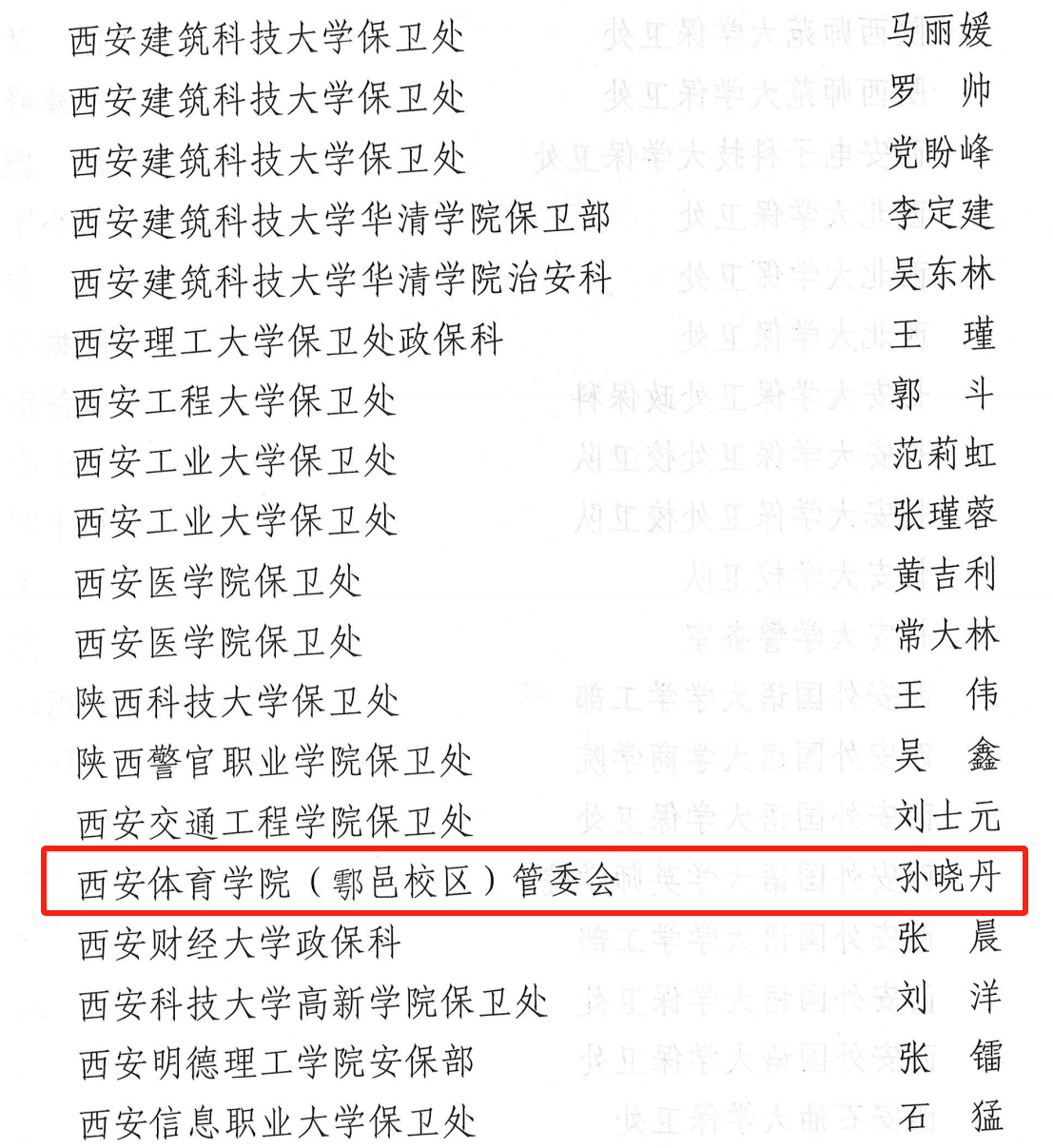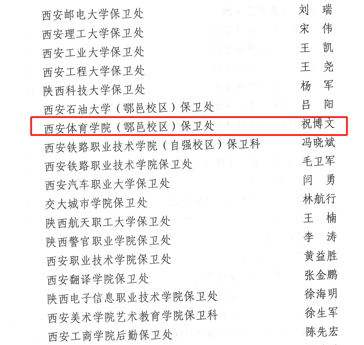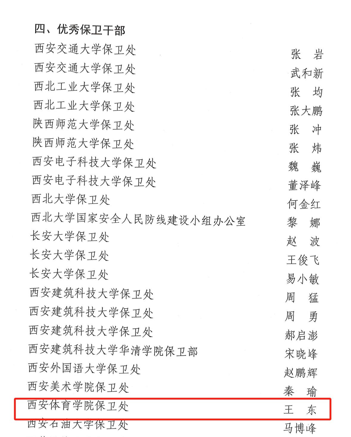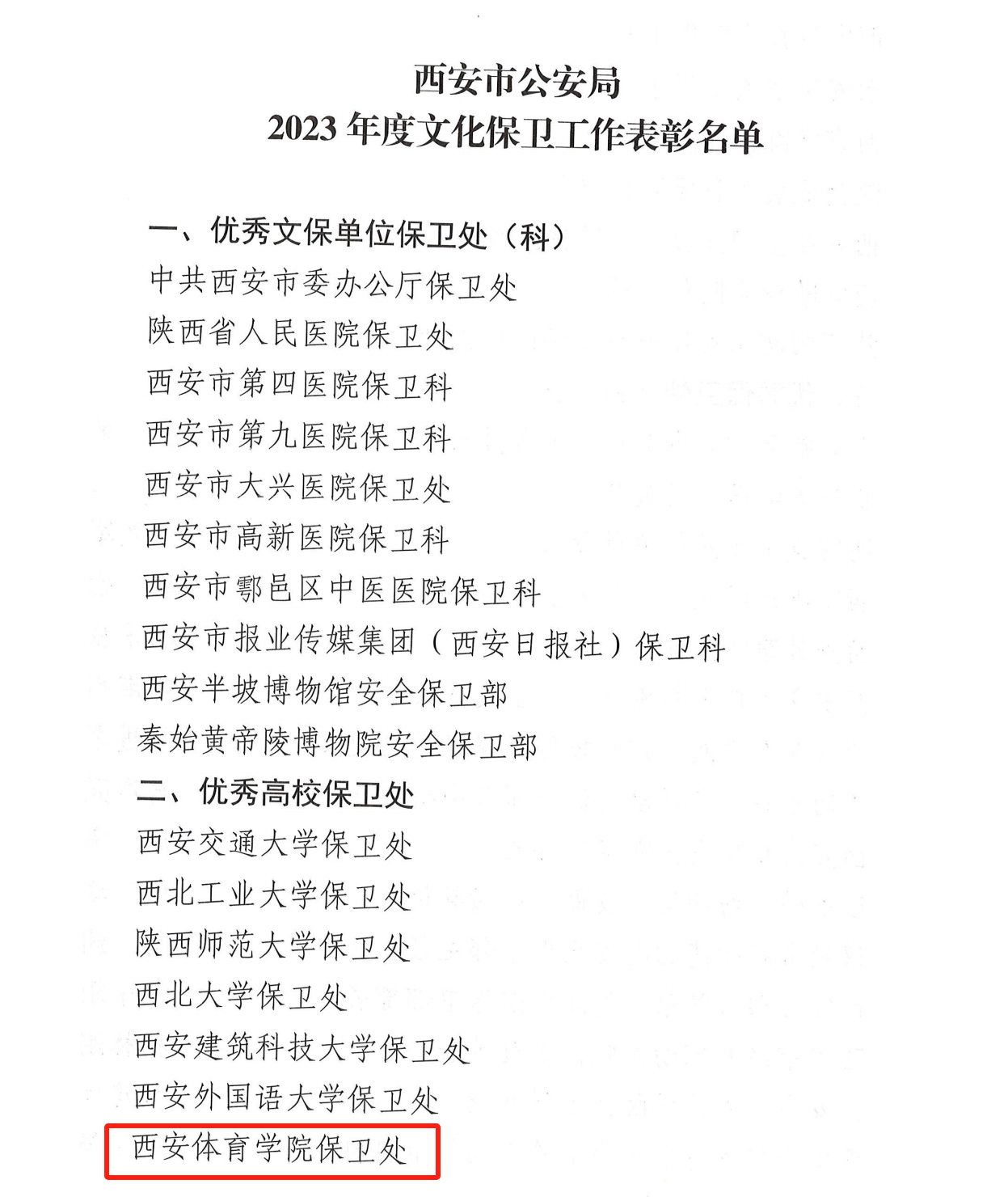 本网讯 近日,西安市公安局发布了《关于表彰2023年度文化保卫工作优秀集体和优秀个人的决定》,365官网保卫处获“全市文化保卫工作优秀高校保卫处”称号,同时365官网保卫处王东、祝博文同志被评为“优秀保卫干部”,李东亮、孙晓丹同志也被评为“优秀信息员”。