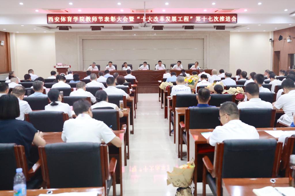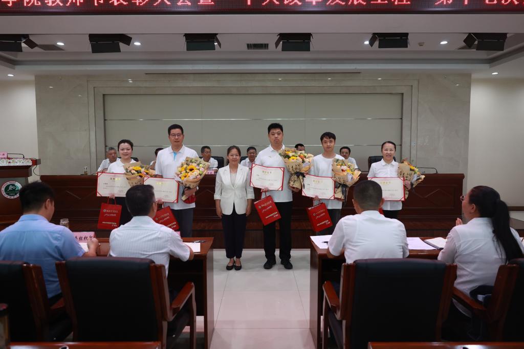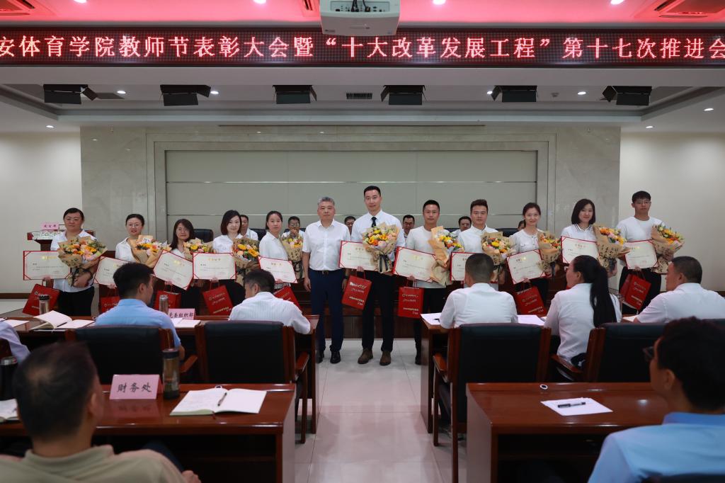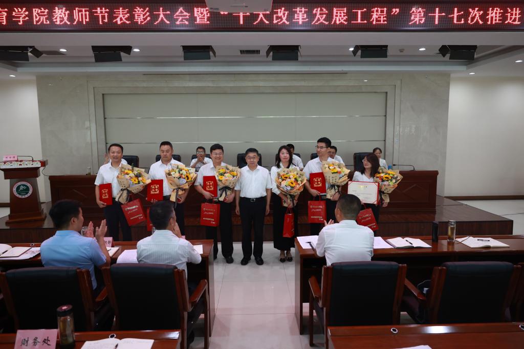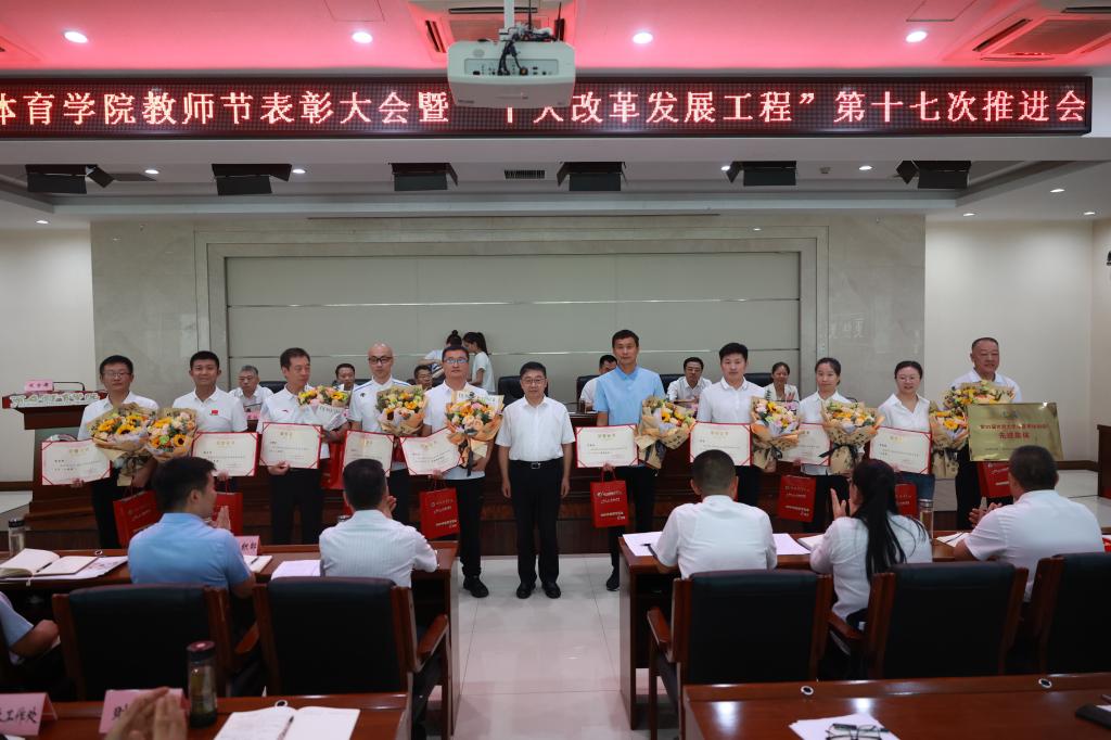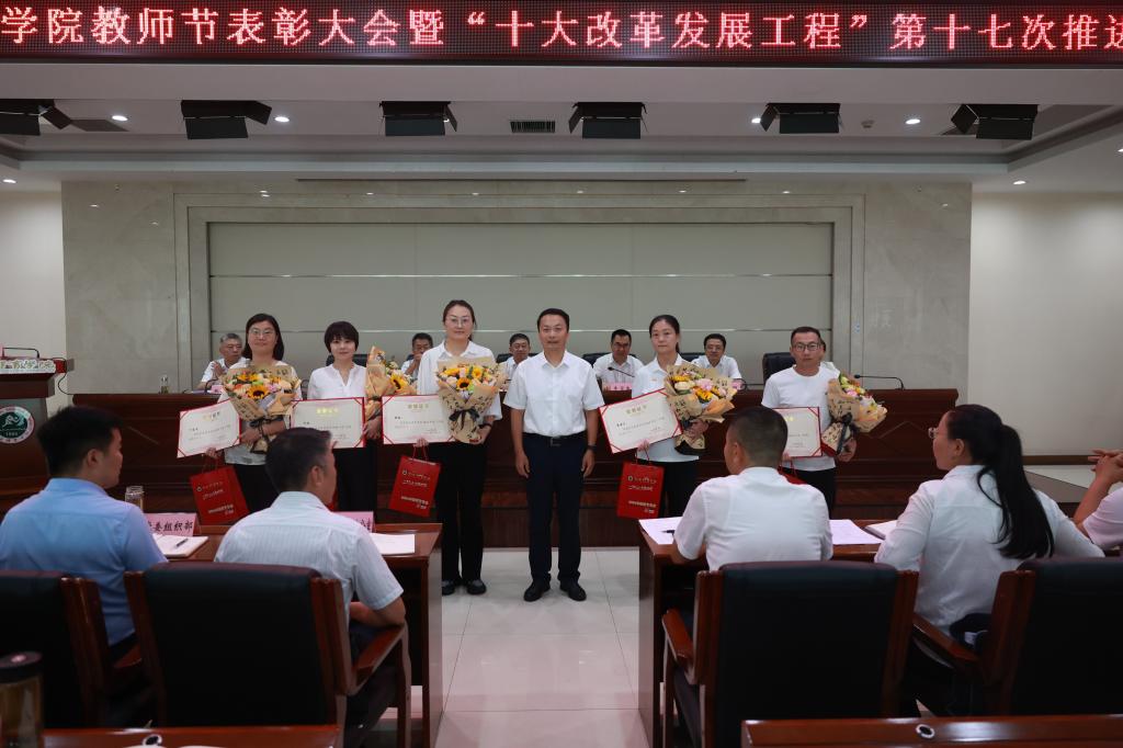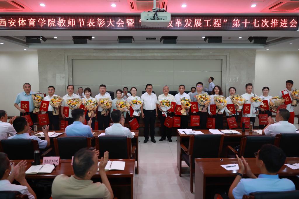 党委副书记、纪委书记、监察专员杨芳乾宣读“优秀青年教师”“教学名师”“师德先进个人”“优秀辅导员”“优秀教练员”“鏖战之星”“师德先进集体”及获得省部级表彰的教师名单。校领导为先进集体和先进个人颁发荣誉证书,并送上鲜花表达祝福。