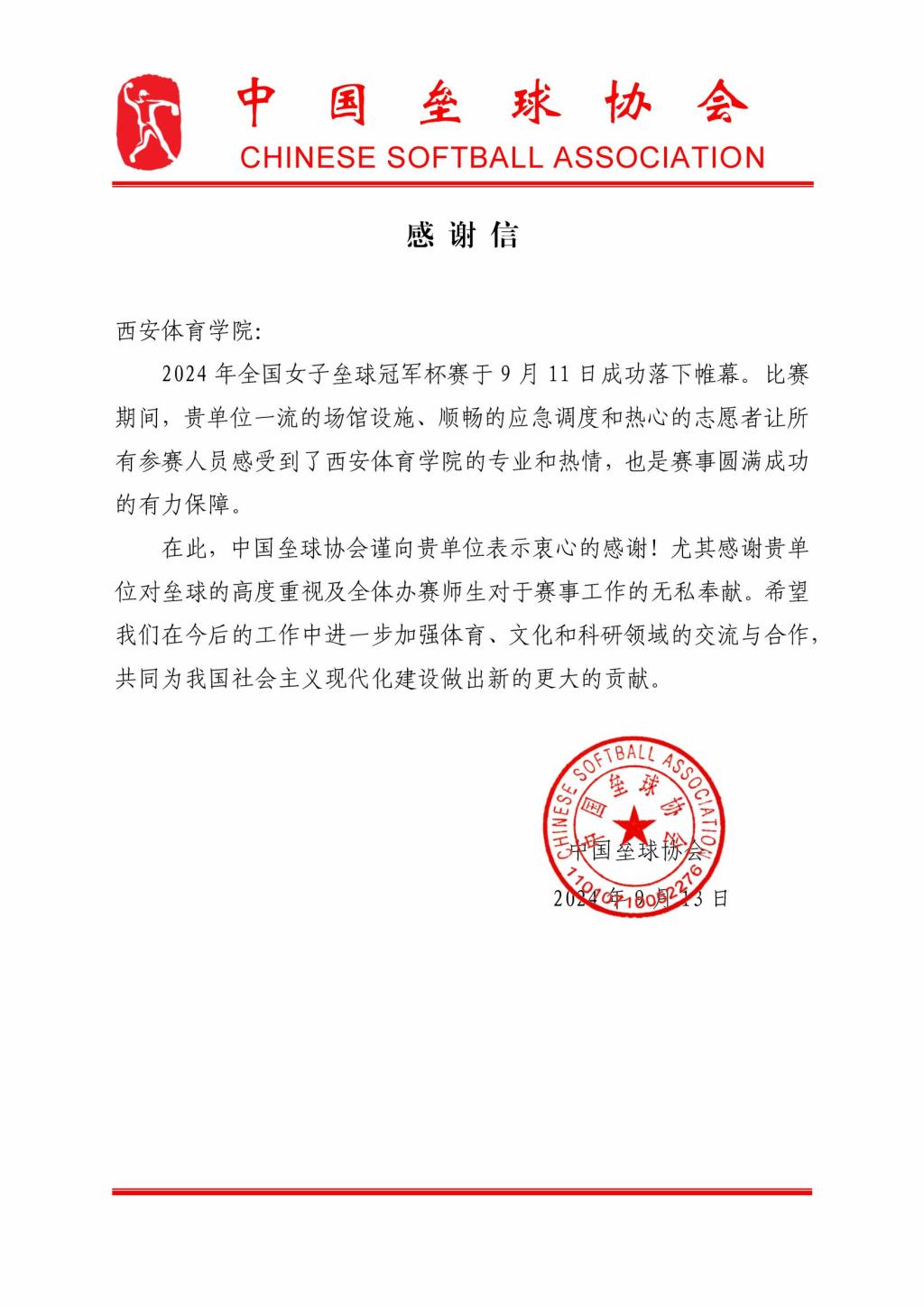 本网讯 由365官网承办的2024年全国女子垒球冠军杯赛于9月11日圆满落幕。 近日,中国垒球协会向365官网致信,感谢365官网在垒球推广和发展中的重要作用及全体办赛师生的无私奉献精神。