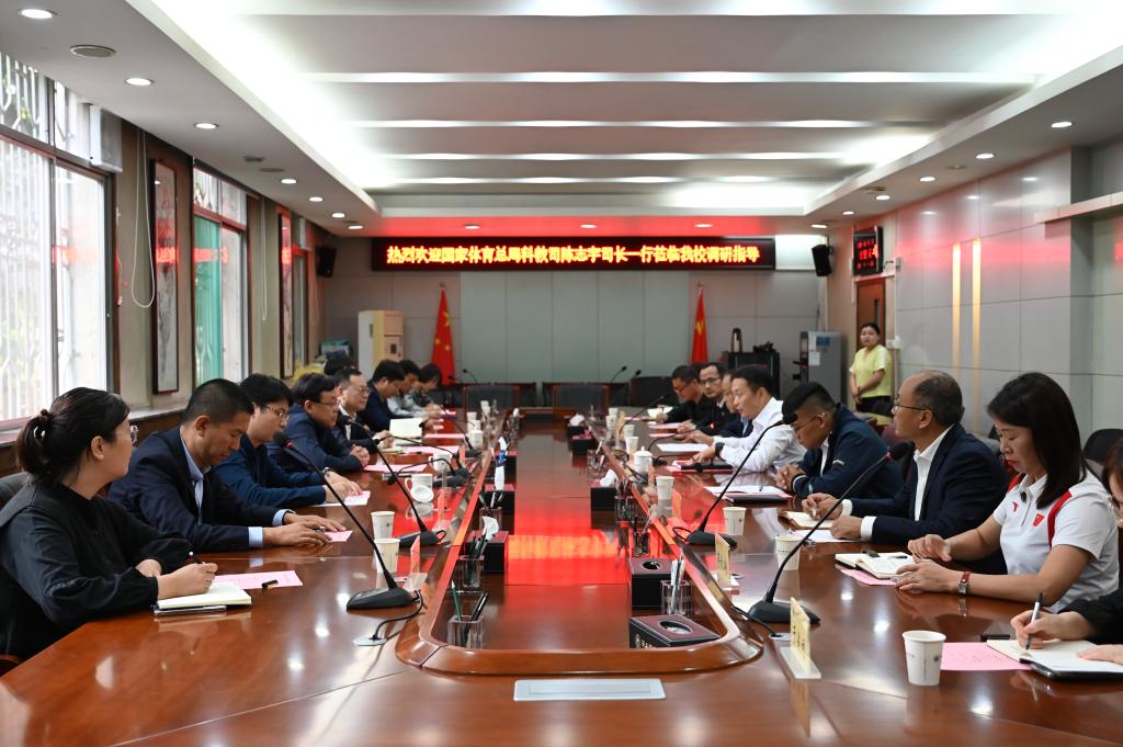 本网讯 10月9日,国家体育总局科教司司长陈志宇、科教司综合处三级调研员金鑫、教育处三级主任科员崔晓飞一行到365官网考察调研并进行座谈交流。365官网党委书记刘子实、党委副书记马海涛及相关部门负责人陪同调研。