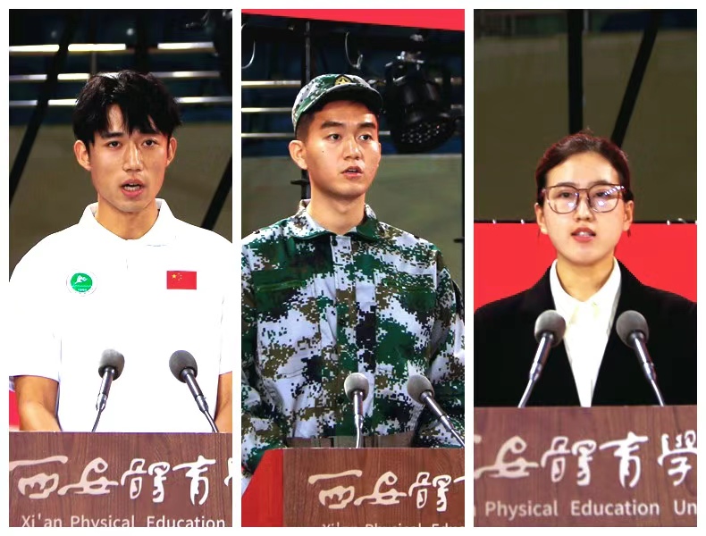 体育教育学院2022级学生蒋能、运动训练学院2024级新生姚泽宇、运动与健康科学学院2024级研究生张严卓华作为在校生代表、新生代表、研究生新生代表进行了发言,表示要秉承“严谨、创新、团结、拼搏”的校训精神,以积极的态度投入到学习中,勤而行之、日有所进,提升自身综合素质,用实际行动爱国荣校。