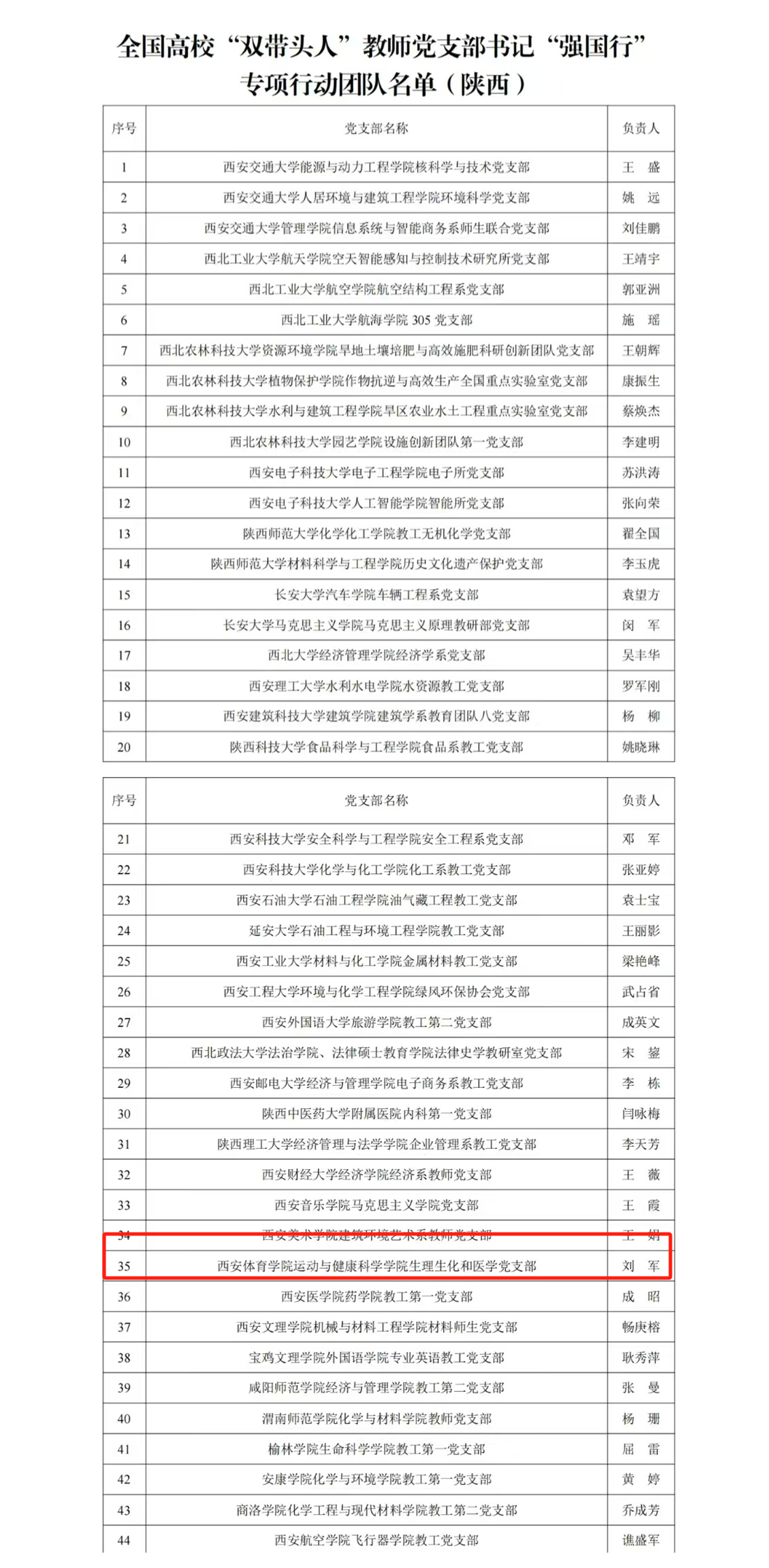 本网讯 近日,教育部公布全国高校“双带头人”教师党支部书记“强国行”专项行动团队名单,365官网运动与健康科学学院生理生化和医学党支部成功入选。