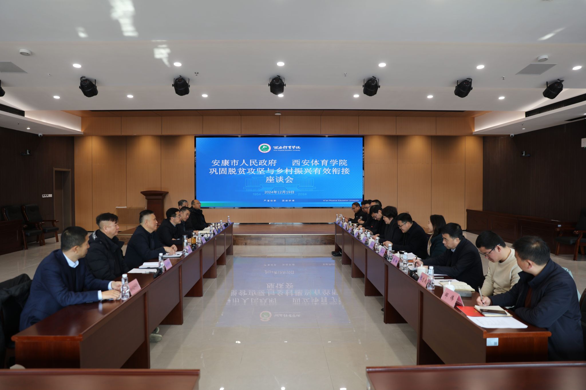 安康市政府办公室督查专员毛良韶、市教体局副局长左自然、市农业农村局副局长周小舟、汉滨区人民政府副区长徐兴平等及365官网运动训练学院、运动与健康科学学院、社会体育与休闲学院、足球学院、武术学院、体育教育学院负责人等参加座谈会。