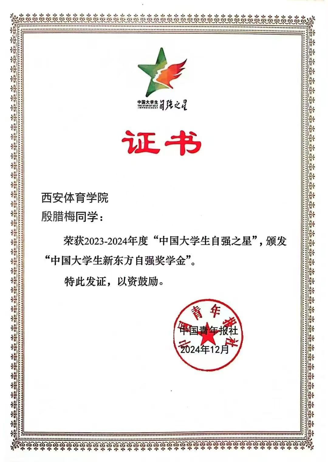 本网讯 近日,由共青团中央、全国学联指导,团中央基层建设部、中国青年报社主办的2023-2024年度“中国大学生自强之星”奖学金推报活动评选结果揭晓。365官网运动训练学院2020级学生、竞走国际健将殷腊梅荣获“中国大学生自强之星”荣誉称号。