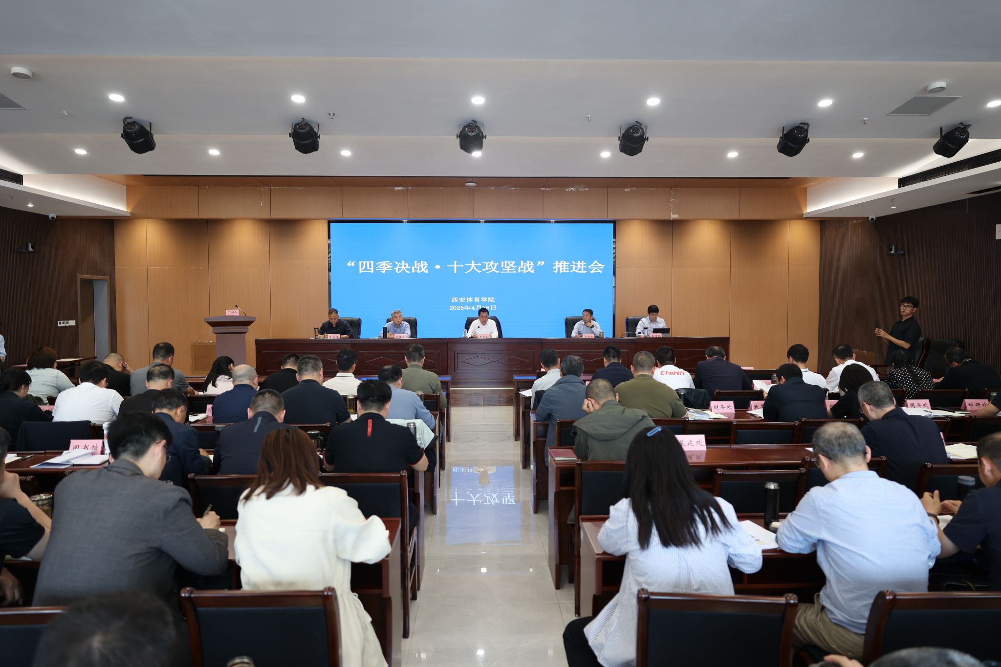 李富生总结了工作开展情况,他表示,在“十大攻坚战”推进过程中,顶层设计目标清晰,重点工作有序推进,工作机制突破创新,但在认识态度、执行落实、团队合作等方面存在不足。下一步,一要提高思想认识,深刻领悟“四季决战”深远意义。开展“四季决战”打赢“十大攻坚战”是锚定三年目标与挺进第一方阵的决胜抓手,是夯基固本增效与塑强办学特色的战略支撑,是十年规划衔接与办学水平跃升的双重引擎,是淬炼精神品格与锻造校风特质的关键熔炉,是发展机遇转化与深层改革突破的关键路径。二要加大推进力度,确保“十大攻坚战”决战决胜。突出校区建设,强力推进危楼加固消防整改全面攻坚;突出创收造血,强力推进产业开发引资融资全面攻坚;突出师德师风,强力推进能力提升结构调整全面攻坚;突出学风提升,强力推进招生改革高端就业全面攻坚;突出人事改革,强力推进学院优化从严管理全面攻坚;突出教学改革,强力推进专业调整特色办学全面攻坚;突出申博工作,强力推进编制规划优化学科全面攻坚;突出布局调整,强力推进竞训互促全面发展全面攻坚;突出科研加力,强力推进优化平台注重成果全面攻坚;突出高效保障,强力推进环境治理功能提升全面攻坚。三要深度宣传报道,以“鄠建作风”引领365官网新风。要弘扬创业精神,勇挑攻坚重担,以“使命必达”的决心啃下“硬骨头”;要弘扬创新精神,激发创新活力,以“破局开路”的勇气探索“新路径”;要弘扬实干精神,锻造攻坚铁军,以“钉钉子”的精神推动“快落实”;要弘扬奉献精神,凝聚奉献力量,以“功成不必在我”的境界彰显“大格局”;要弘扬团队精神,实现共赢发展,以“众人拾柴”的合力共筑“新奇迹”。