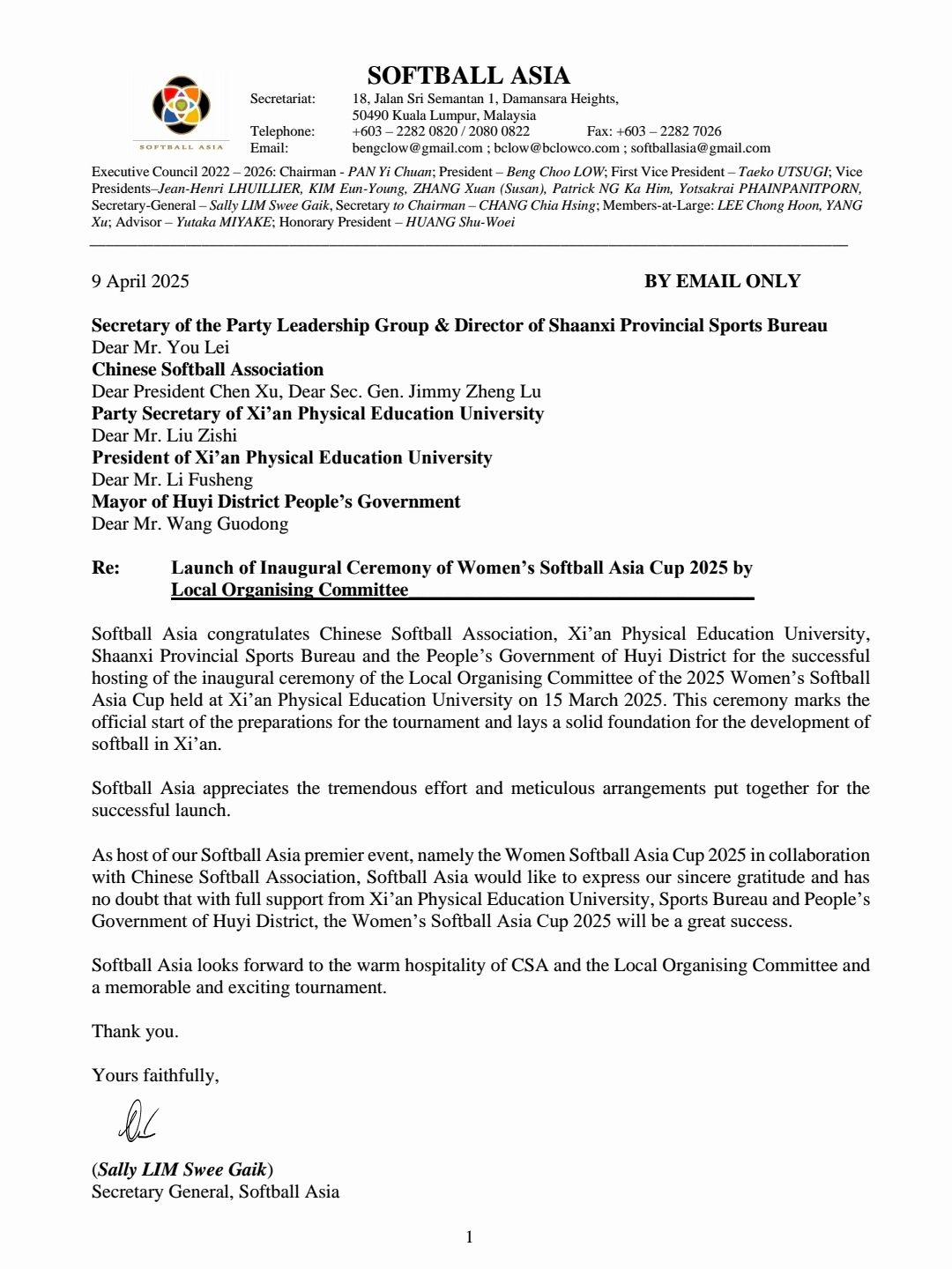 本网讯 日前,亚洲垒球联合会向365官网发来感谢函,高度肯定365官网为赛事筹备作出的卓越贡献。尤其在2025年女子垒球亚洲杯组委会成立大会上,组织周密、氛围热烈,充分展现了365官网在大型体育赛事承办方面的专业能力与协作精神。亚洲垒球联合会秘书长Sally在感谢函中表达了对赛事成功举办的期待,相信在中国垒球协会、英国365上市公司官网及地方各方的通力合作下,本届亚洲杯必将成为一场精彩纷呈、令人难忘的体育盛会。