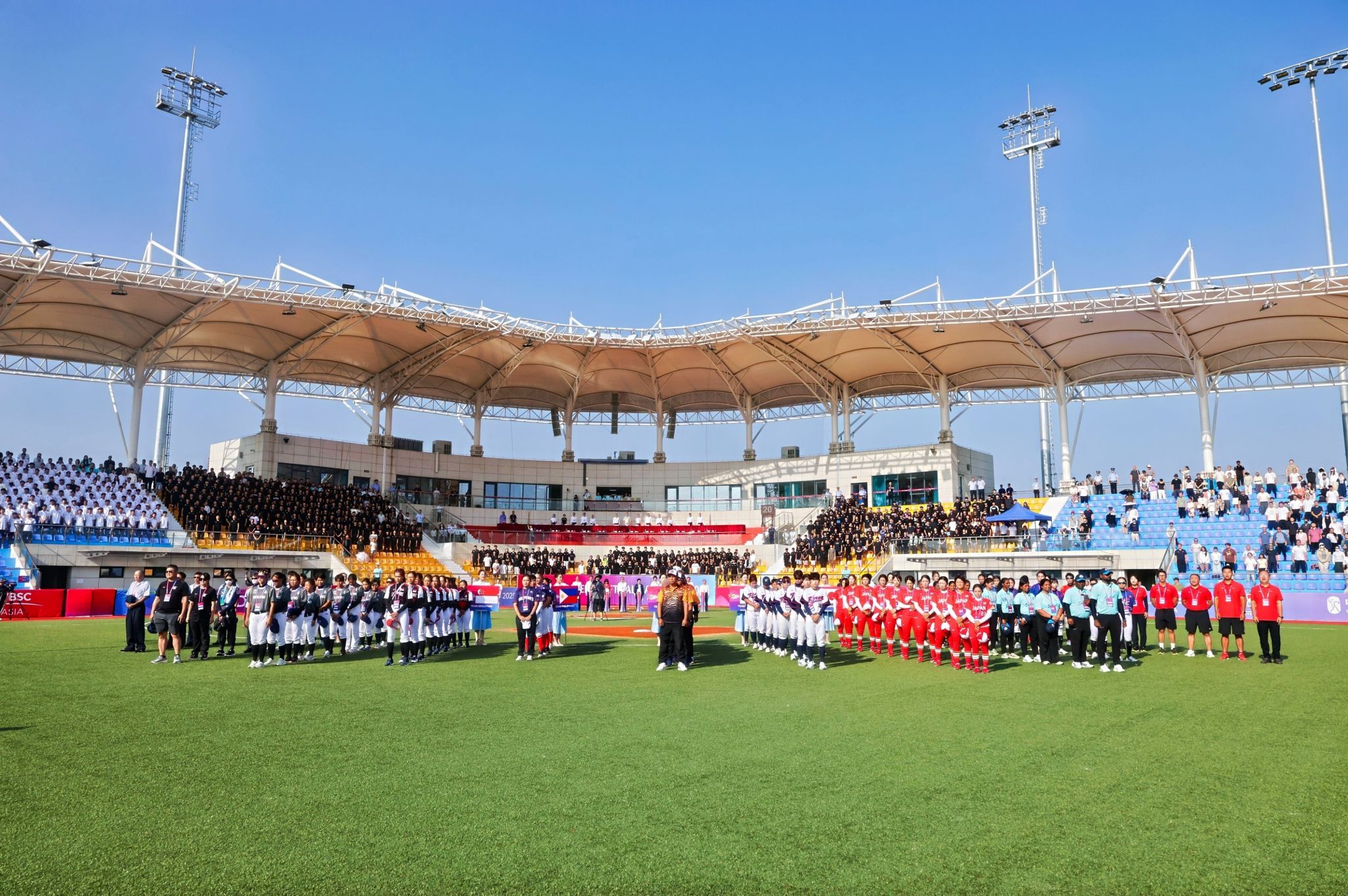 全体嘉宾与参加揭幕战的中国队与印度队运动员代表共同开球,标志着2025年女子垒球亚洲杯正式开赛。揭幕战东道主中国队率先登场,迎来与印度队较量。中国队目前世界排名第12,印度队排名第55。比赛一开始,双方就展开了激烈争夺。1局下半,中国队颜思语打出三垒安打击穿对手左外场,随着谢悦再次敲出安打,中国队率先得分。随后中国队愈战愈勇,队员们进攻端积极主动气势如虹,不断下分,防守端一次次成功化解印度队的进攻。3局下半中国队已领先15分,根据“提前结束规则”(mercy rule),中国队15-0战胜印度队取得开门红。