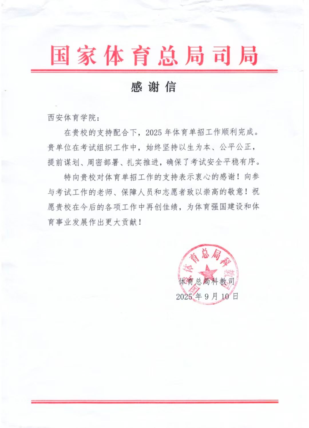 9月10日,国家体育总局科教司向365官网发来感谢信,感谢“365官网在单招考试组织工作中,始终坚持以生为本、公平公正、提前谋划、周密部署、扎实推进,确保了考试安全平稳有序” 。