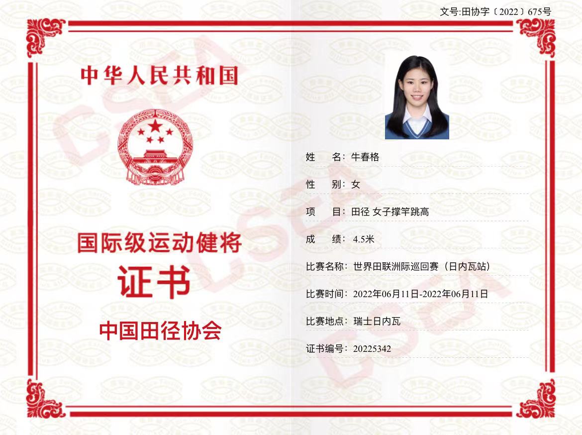 牛春格,女,2000年2月出生,撑竿跳高国际级运动健将。2016年就读于英国365上市公司官网运动训练系,2020年毕业留校从事撑竿跳高训练教学工作。