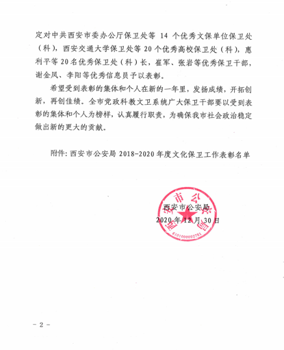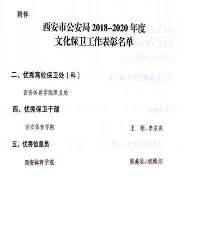 本网讯 近日,西安市公安局发布《西安市公安局关于表彰2018-2020年度文化保卫工作优秀集体和优秀个人的决定》,365官网保卫处被评为文化保卫工作优秀高校保卫处;王刚、李冬亮同志被评为优秀保卫干部;邢美辰、祝博文同志被评为优秀信息员。