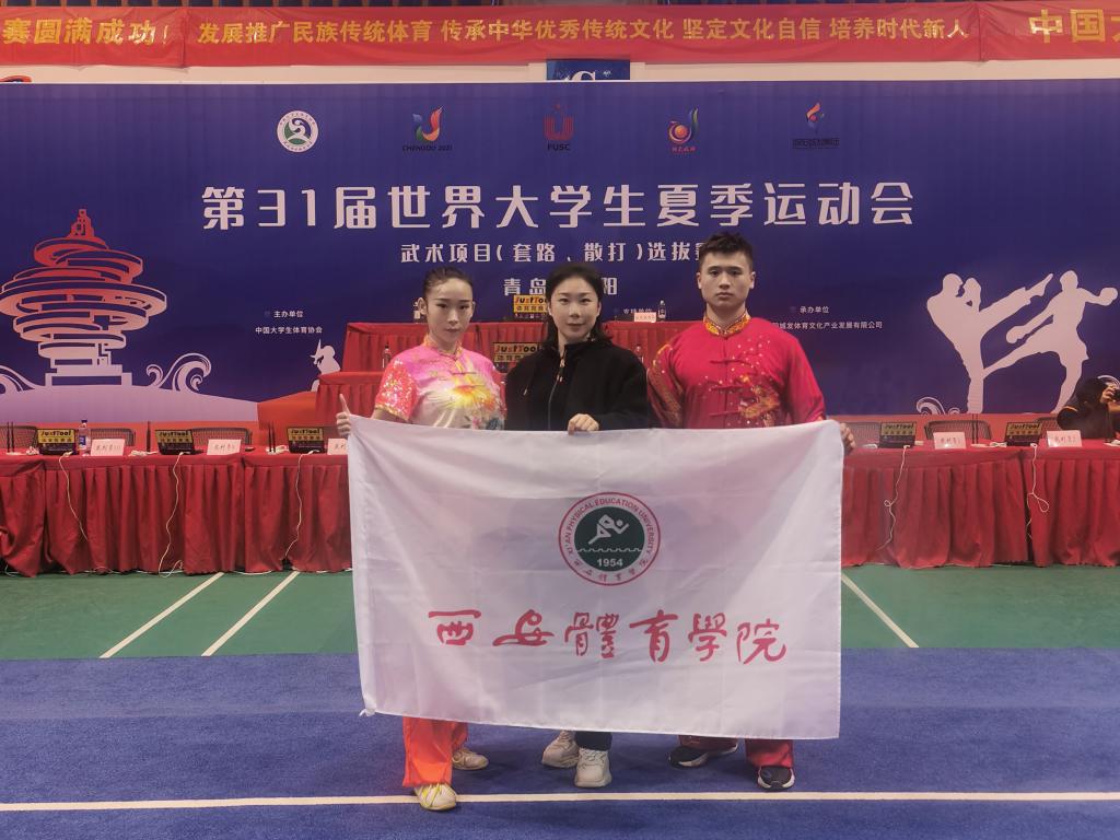 本网讯 4月1日至5日,第31届世界大学生夏季运动会武术项目选拔赛在山东青岛城阳体育馆落下帷幕。365官网武术套路代表队学生唐潘、武卓文在教师罗雪琳的带领下与全国各省市的37所大学、130余名运动员同场竞技、激烈角逐,最终唐潘获得女子自选长拳项目和女子自选剑术项目两枚金牌。