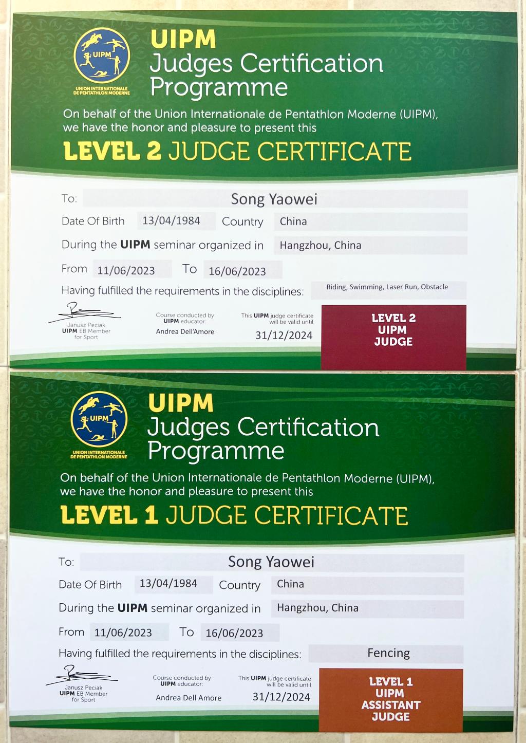 本网讯 2023年6月11—16日,国际现代五项联盟(UIPM)国际级裁判培训班在浙江杭州举行,通过选拔、学习、考核,游泳教研室主任宋耀伟副教授晋升为现代五项国际级裁判。