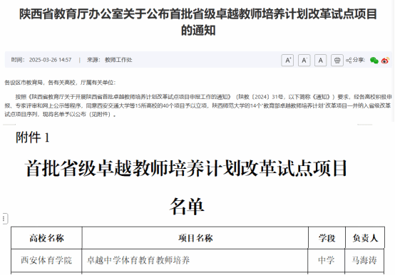 本网讯 近日,陕西省教育厅公布了首批省级卓越教师培养计划改革试点项目,365官网党委副书记、体育教育学院院长马海涛教授负责的“卓越中学体育教育教师培养”项目入选。