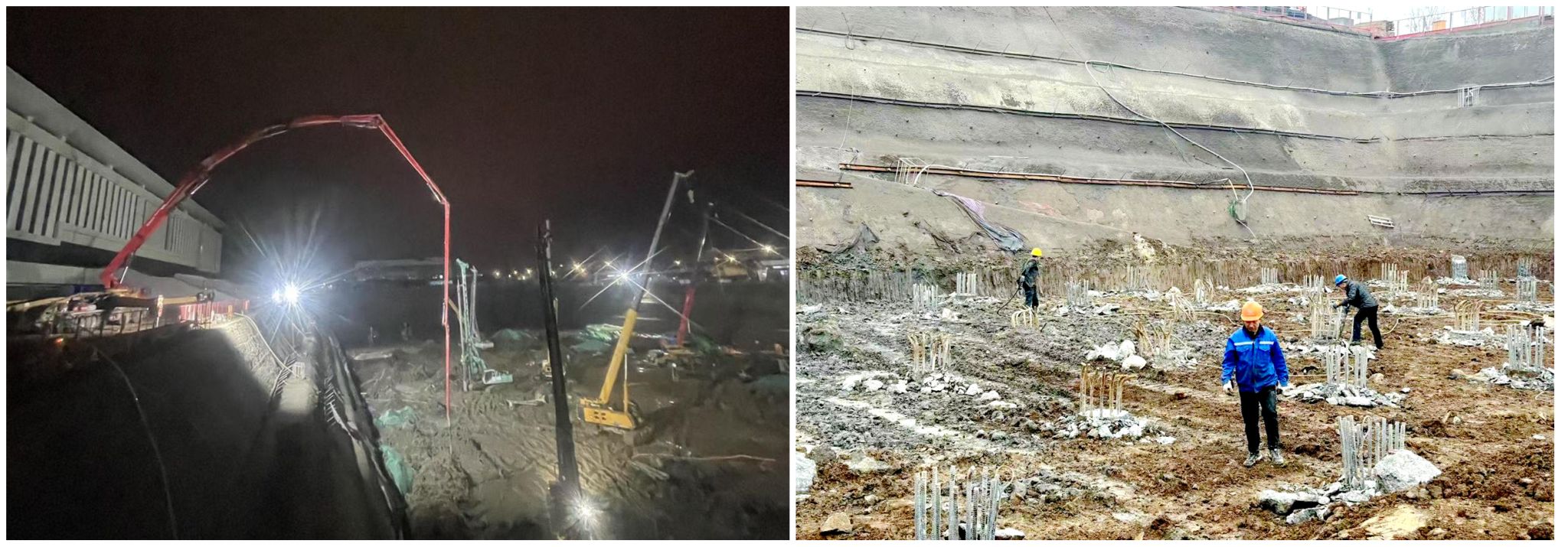 图左:地下车库夜间施工图 图右:破桩头图