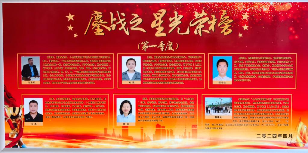 5月17日,我院召开“十大改革发展工程”第八次推进会,会上对第一季度评选出的“鏖战之星”进行了表彰。基建处被评为二级单位鏖战之星,甘泽军、安锐获个人“鏖战之星”荣誉称号。