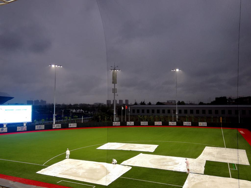 5月14日晚,当十四运会垒球测试赛赛前各项工作即将收尾结束时,鄠邑区气候骤变,大风暴雨转瞬到来,垒球场内的比赛红土,门口的安检门、遮雨棚等都面临着恶劣气候的考验。