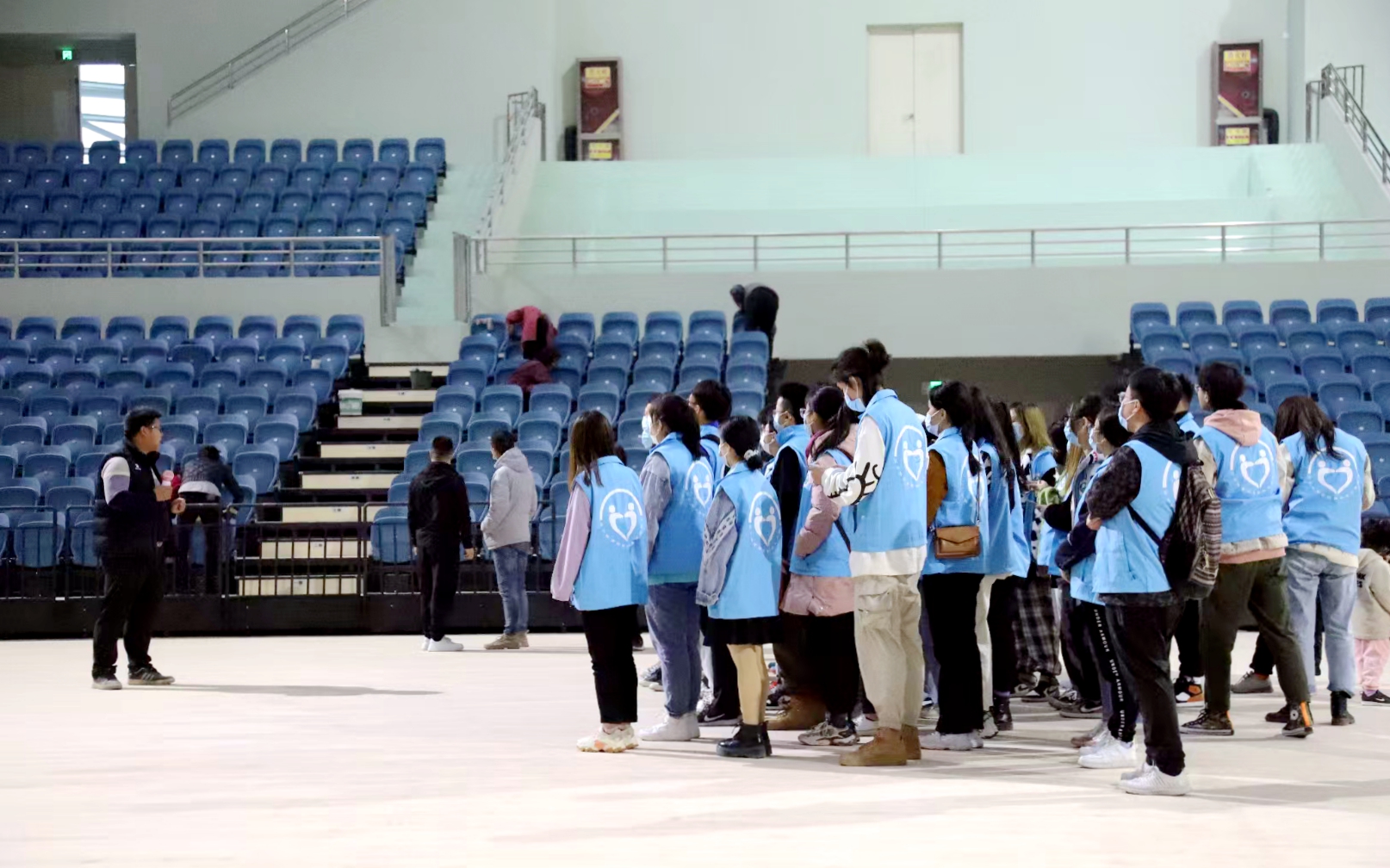 尚育锟(左一)向大学生志愿者介绍手球馆体育工艺情况