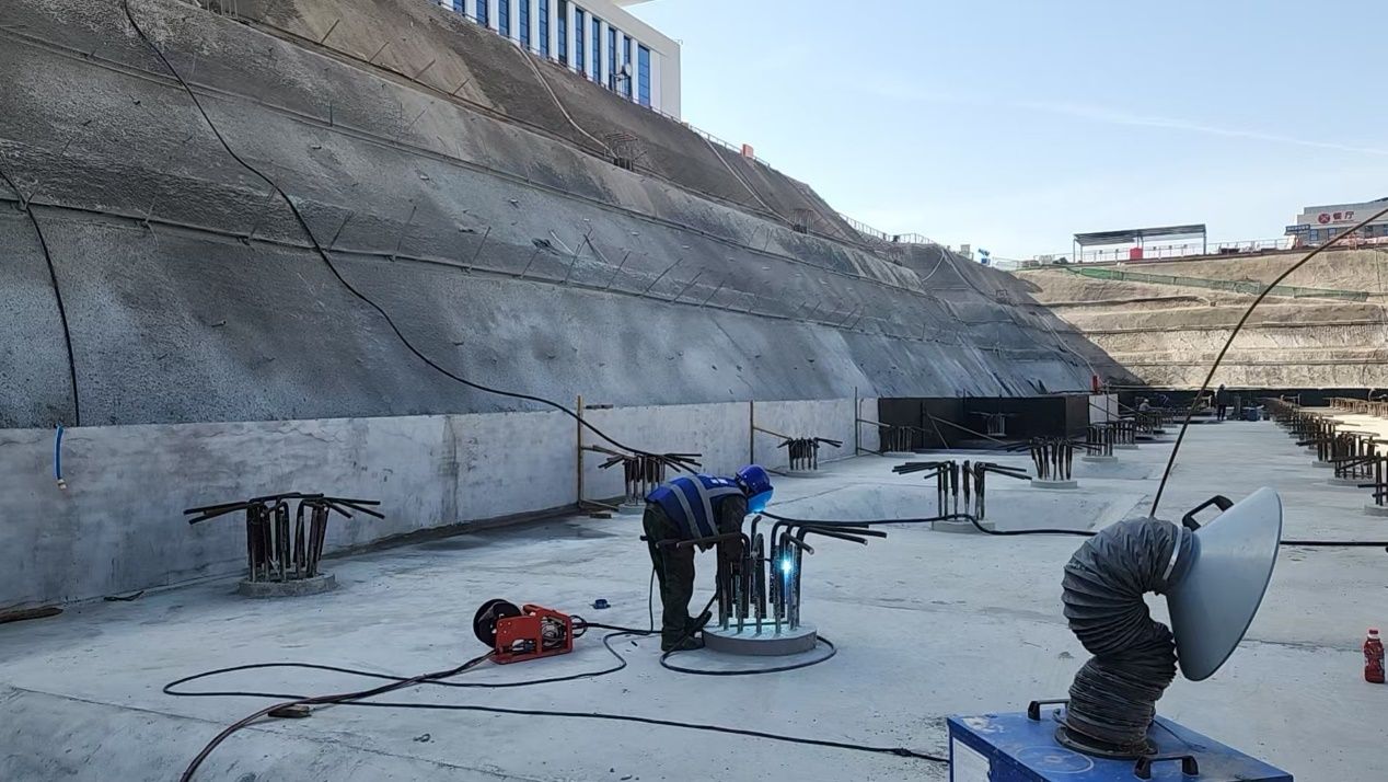 4月28日,鄠邑校区地下人防项目继前日启动高性能防水卷材敷设后,南段区域继续扩大冷底油喷涂、防水卷材铺装范围,同步推进防水层与结构接缝处理,并与当日完成5根灌注桩钢筋锚固焊接。