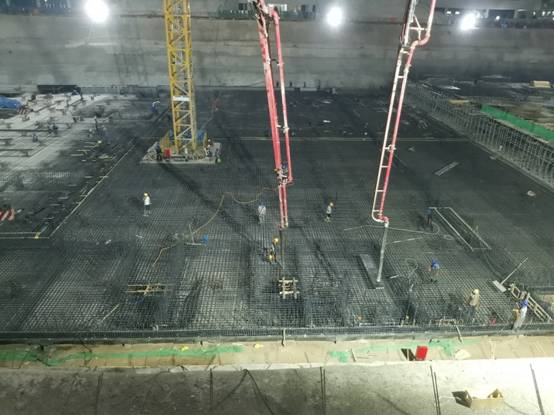中段施工进展顺利,基础筏板底筋直螺纹套筒连接及绑扎工作已全部完成,面筋直螺纹套筒连接及绑扎完成90%,墙柱基础插筋完成70%,基础筏板砼浇筑完成90%,剩余部分将尽快完成,确保中段基础工程的稳定性和安全性。