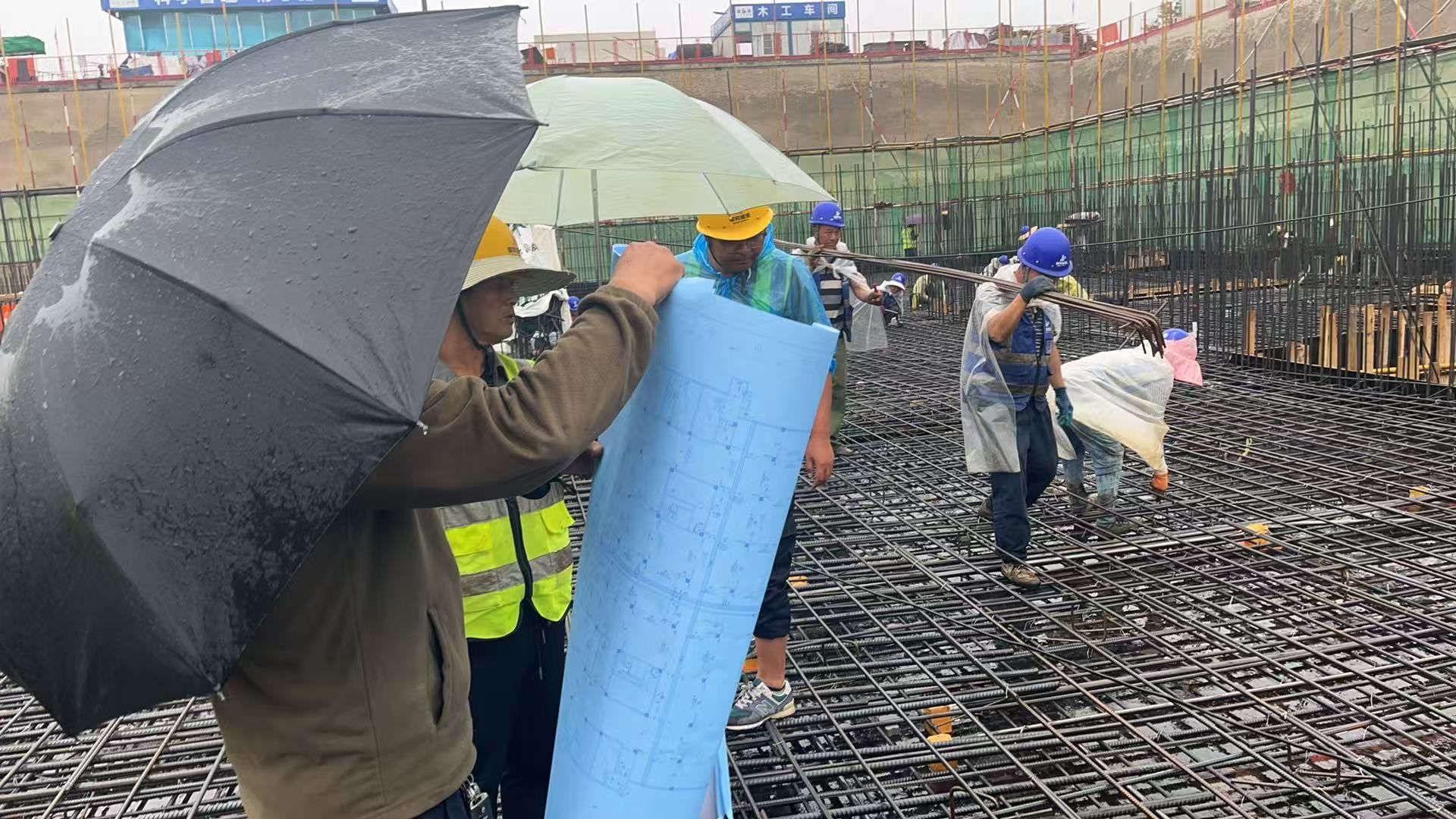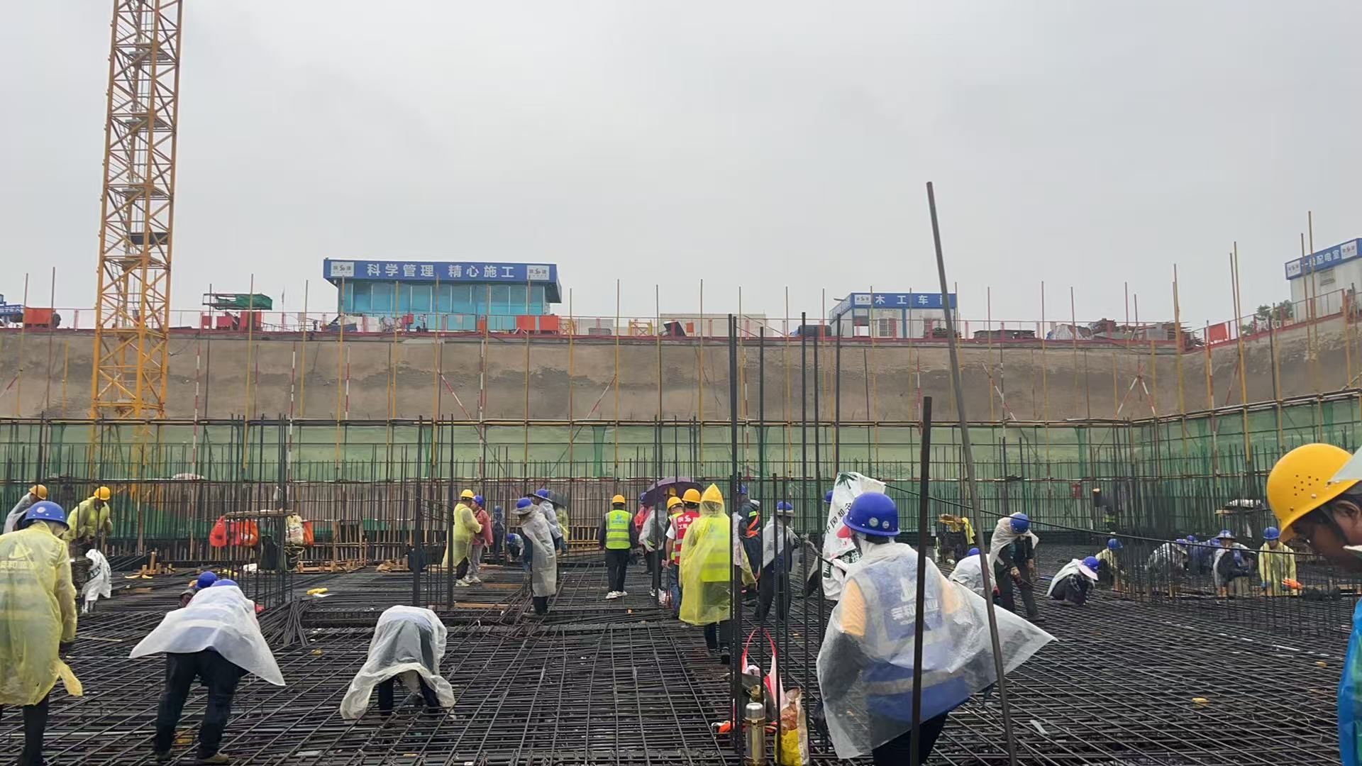 截止发稿,地下人防工程正冒雨抢工,力争31日启动南段负三层结构混凝土灌注作业。