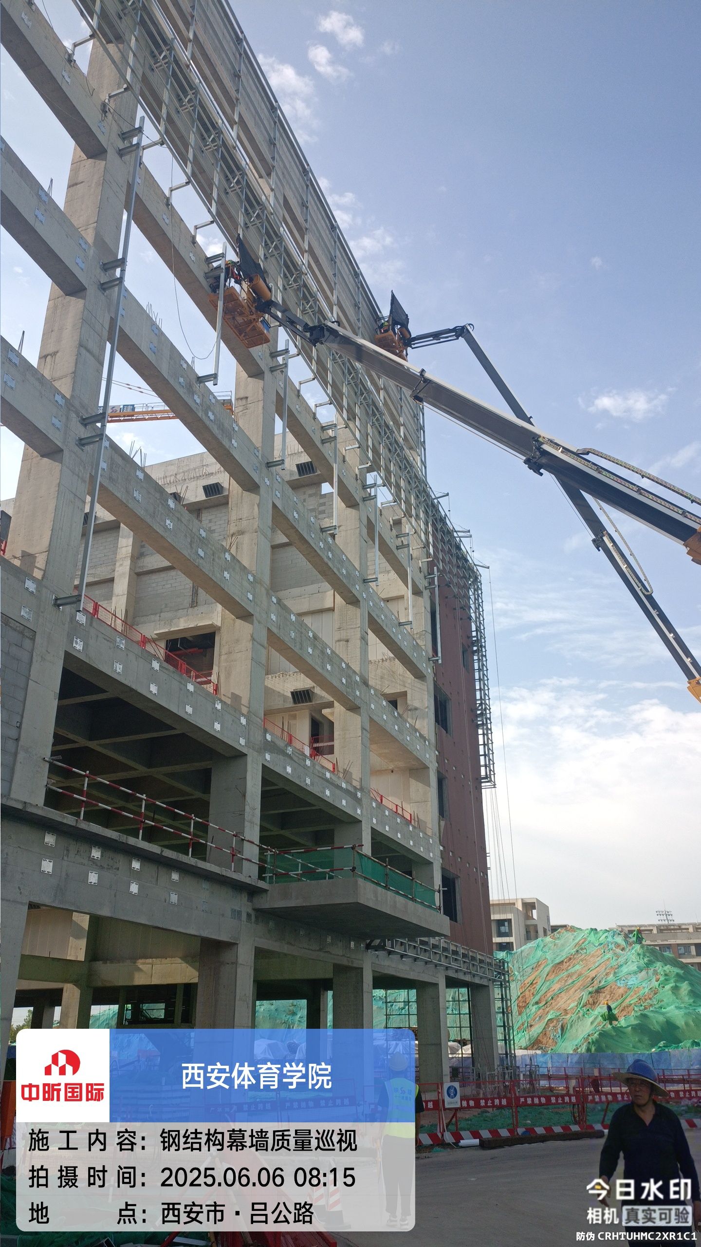 截止6月6日,鄠邑校区风雨操场项目迎来关键施工节点,施工团队抢抓晴好天气,组织工人身着专业安全装备,借助标准化吊篮开展凌空作业,标志着室外幕墙工程正式进入高空攻坚阶段。