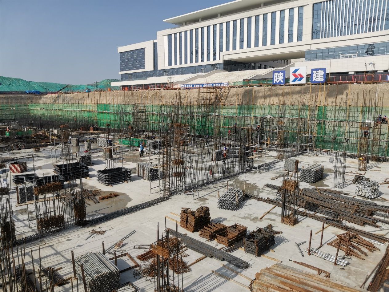 南段施工区域负二层顶板框架梁模板支设基本完成,框架梁及顶板钢筋绑扎有序同步推进中,按计划推进完成40%;施工人员正加快推进剩余部分,为后续钢筋安装和混凝土浇筑创造条件。